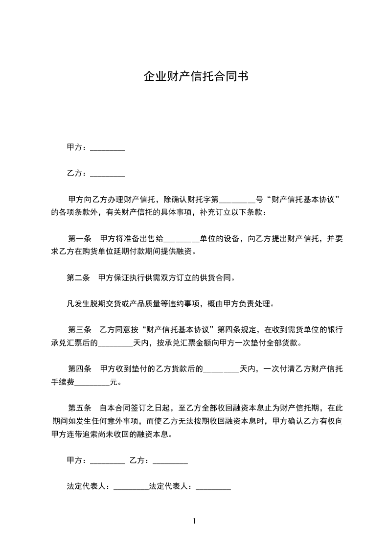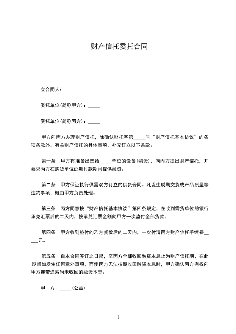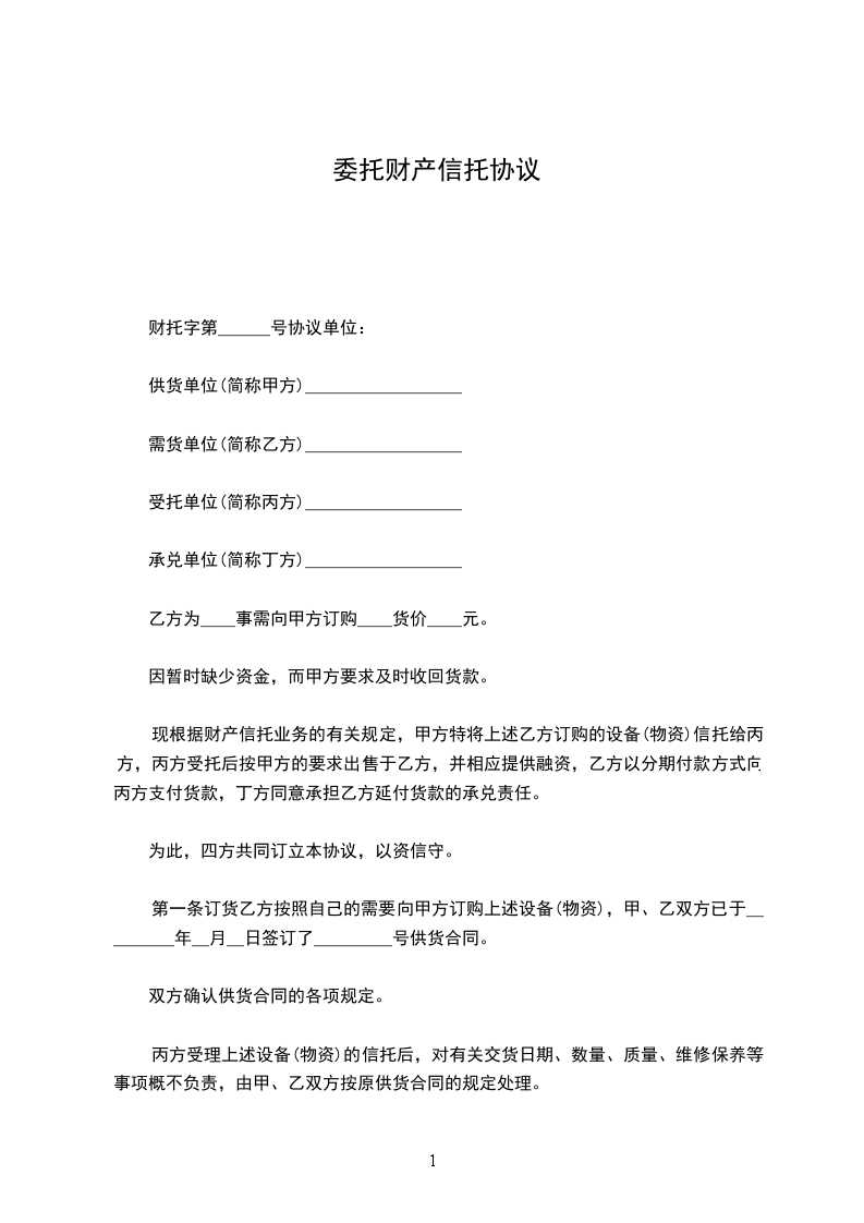 第一条甲方将准备出售给_____单位的设备(物资),向丙方提出财产信托,并要求丙方在购货单位延期付款期间提供融资。