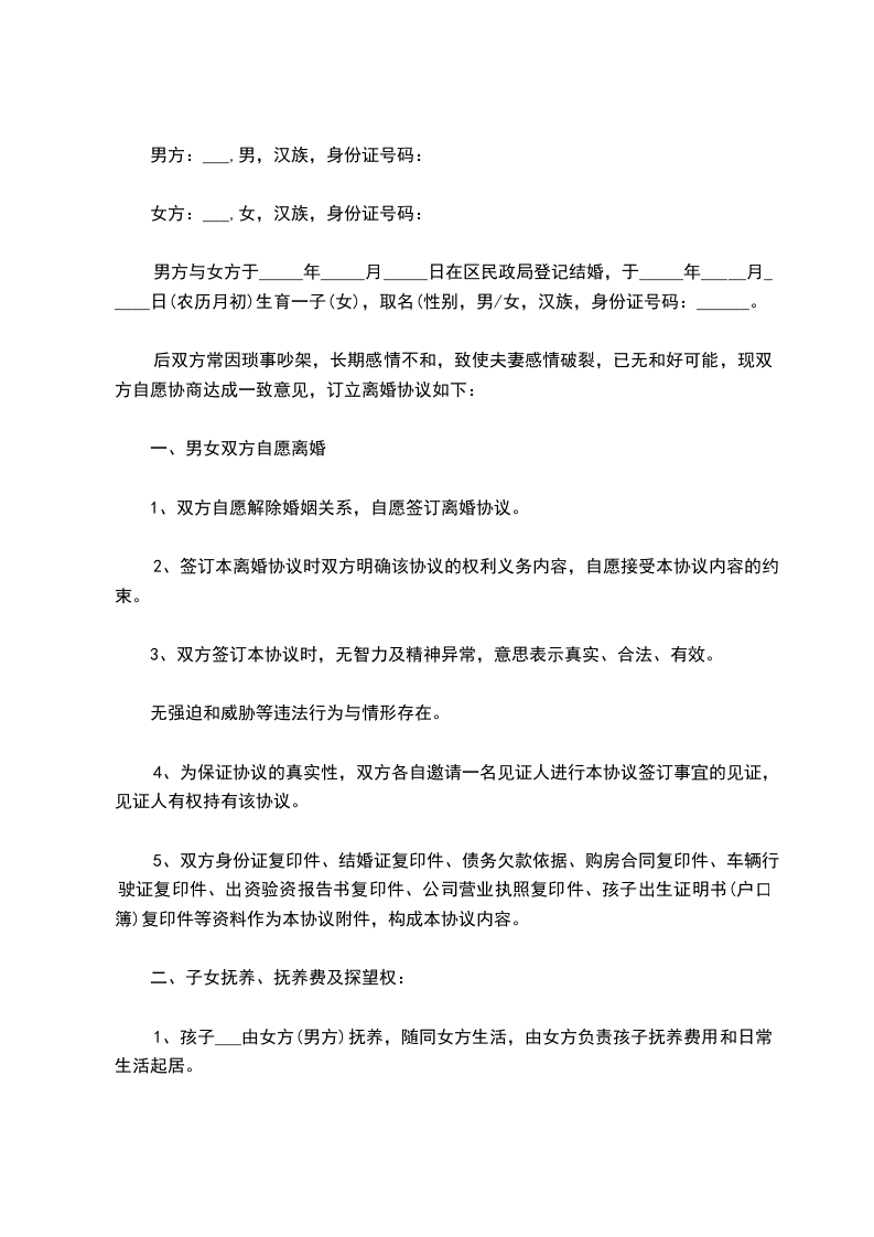 1、孩子___由女方(男方)抚养,随同女方生活,由女方负责孩子抚养费用和日常生活起居。