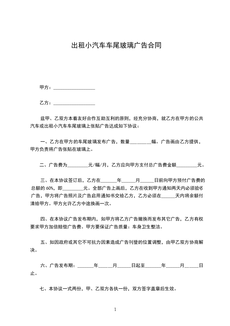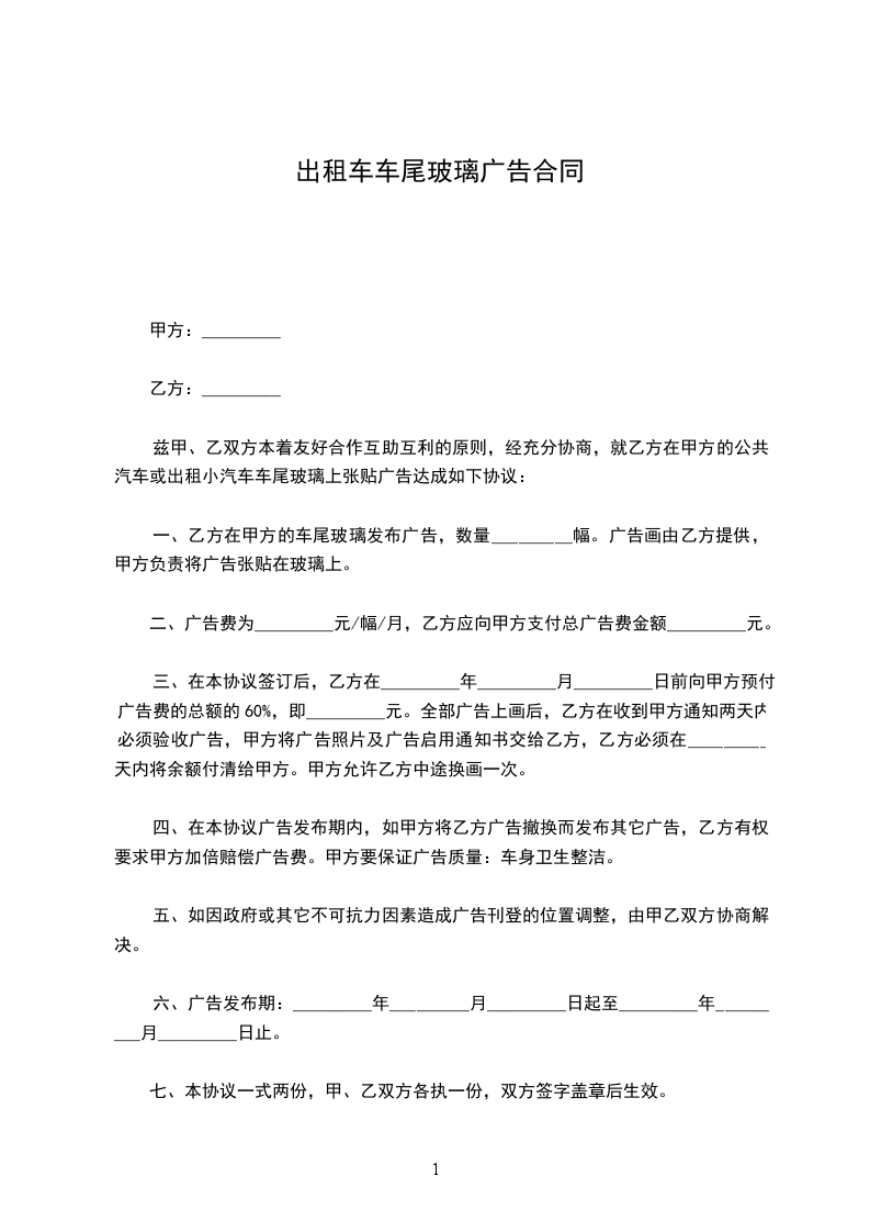 兹甲、乙双方本着友好合作互助互利的原则,经充分协商,就乙方在甲方的公共汽车或出租小汽车车尾玻璃上张贴广告达成如下协议: