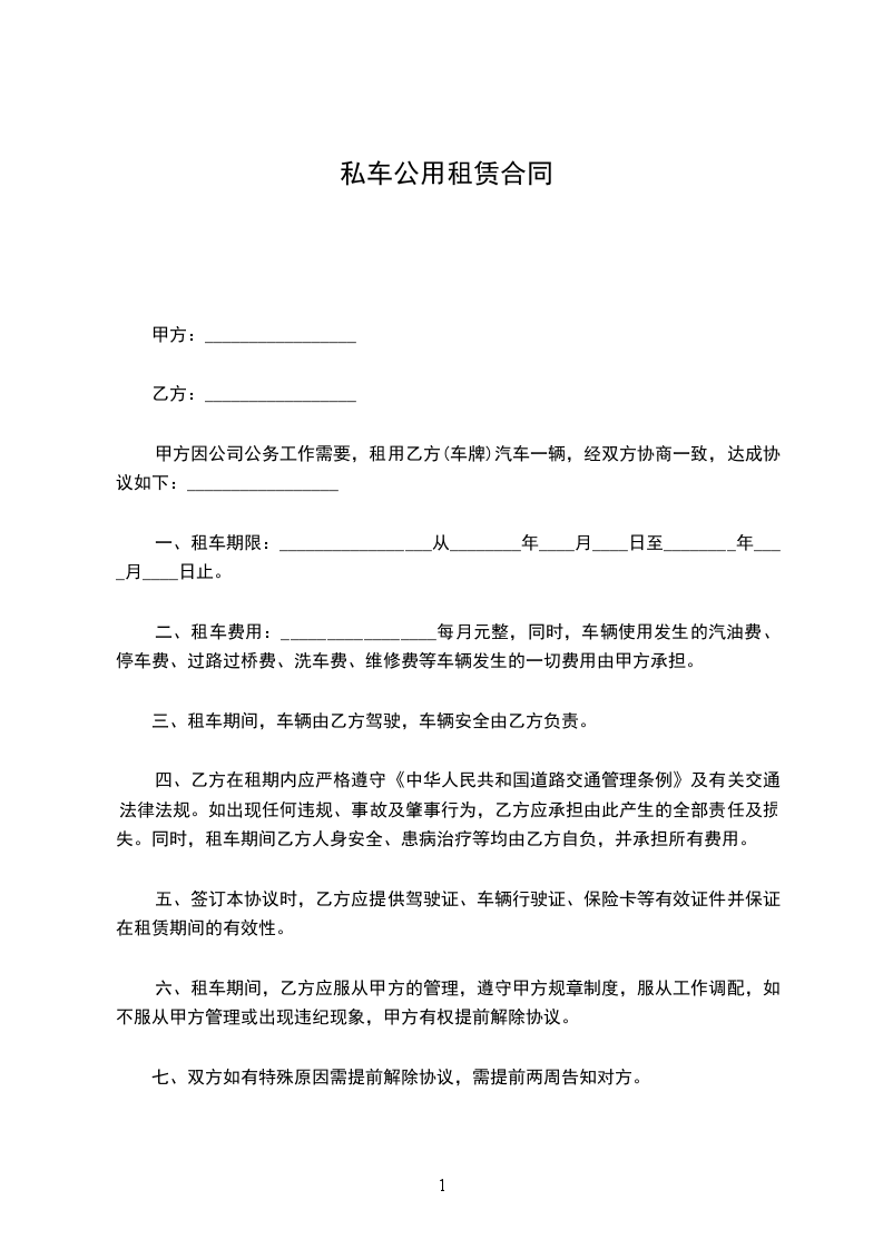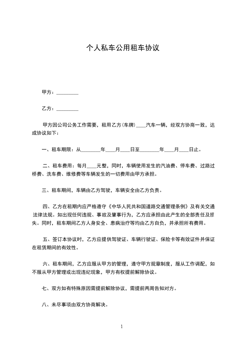 私车公用租车协议书范本