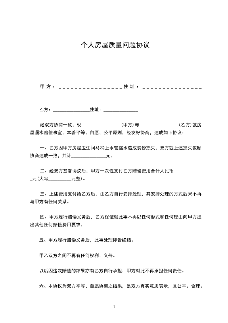 一、乙方在收到经济补偿金后,承诺放弃由质量问题引起的退房、投诉、经济赔偿、仲裁及法律起诉等不利于甲方的行为。
