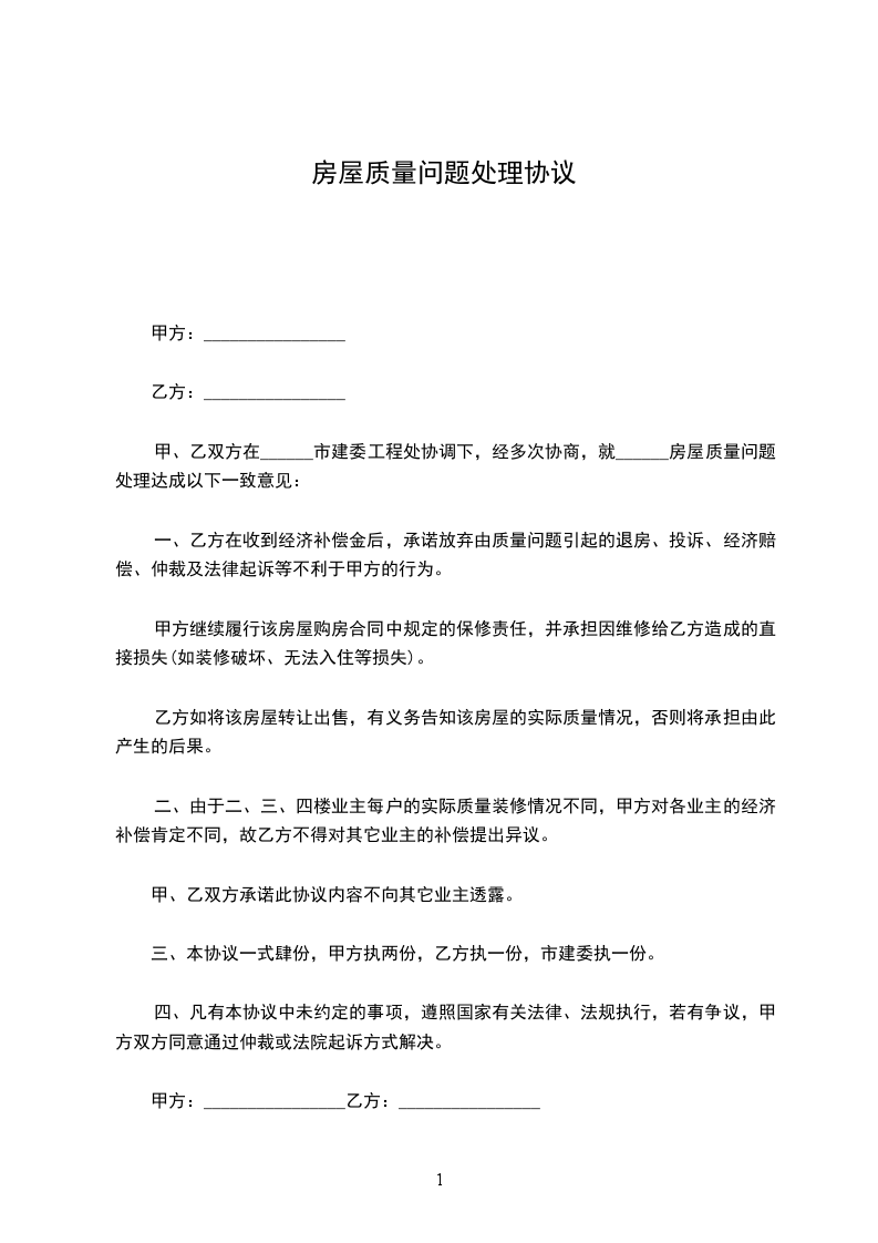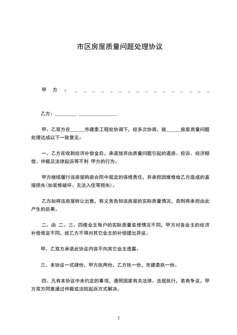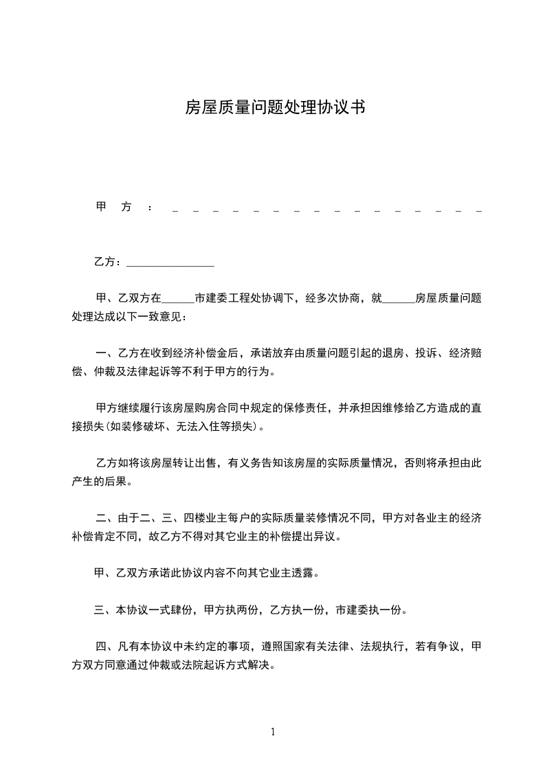 甲、乙双方在______市建委工程处协调下,经多次协商,就______房屋质量问题处理达成以下一致意见: