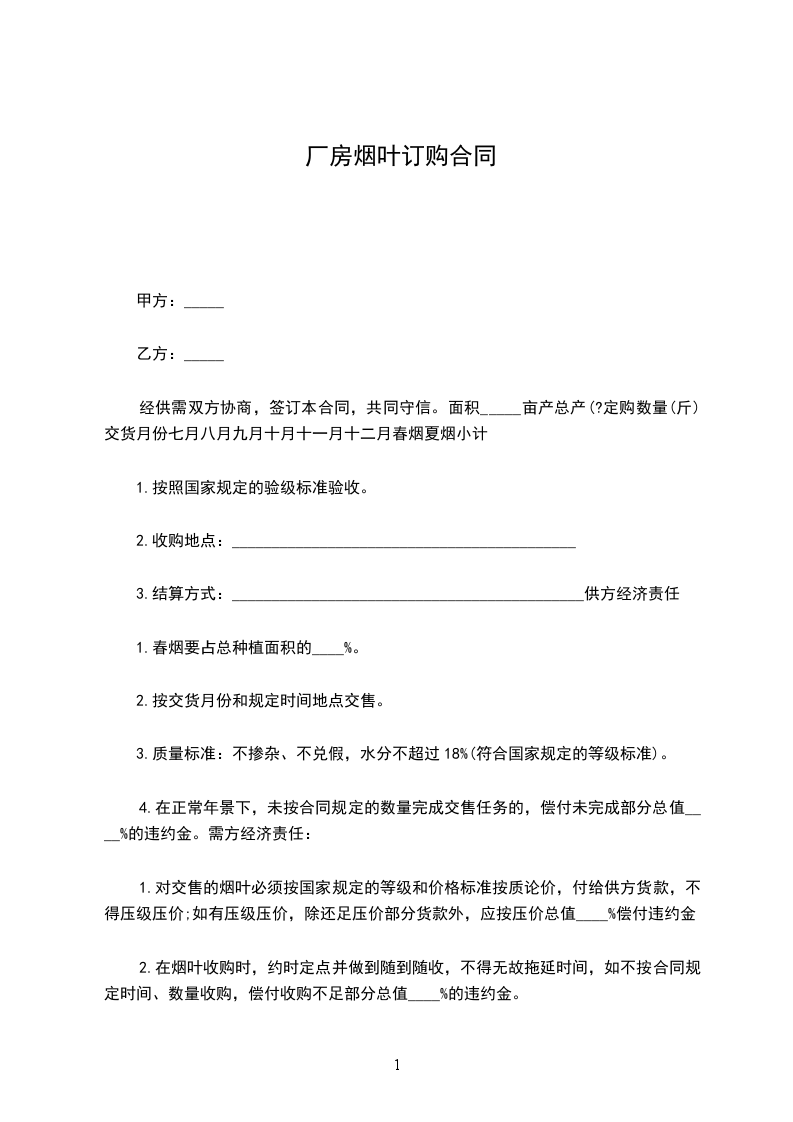 1.对交售的烟叶必须按国家规定的等级和价格标准按质论价,付给供方货款,不得压级压价;如有压级压价,除还足压价部分货款外,应按压价总值____%偿付违约金。