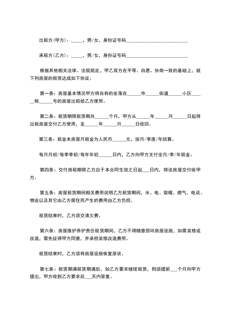 承租方(乙方):_____,男/女,身份证号码___________________________