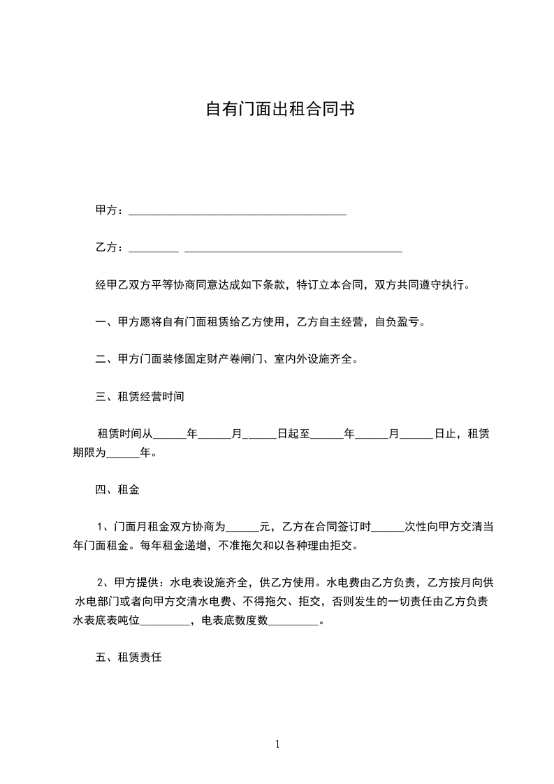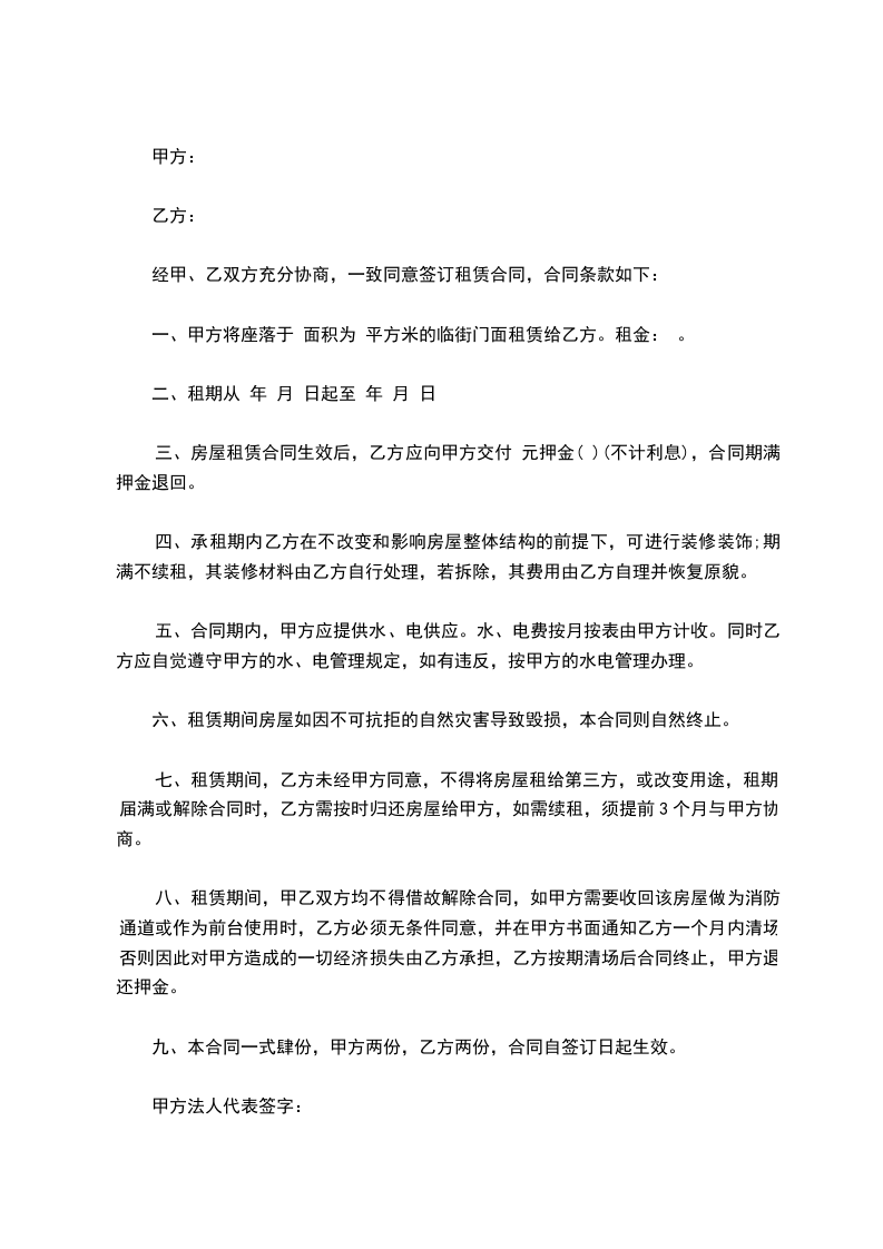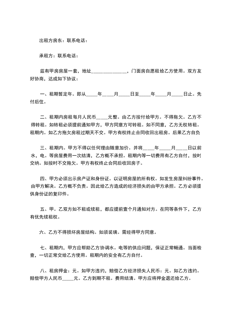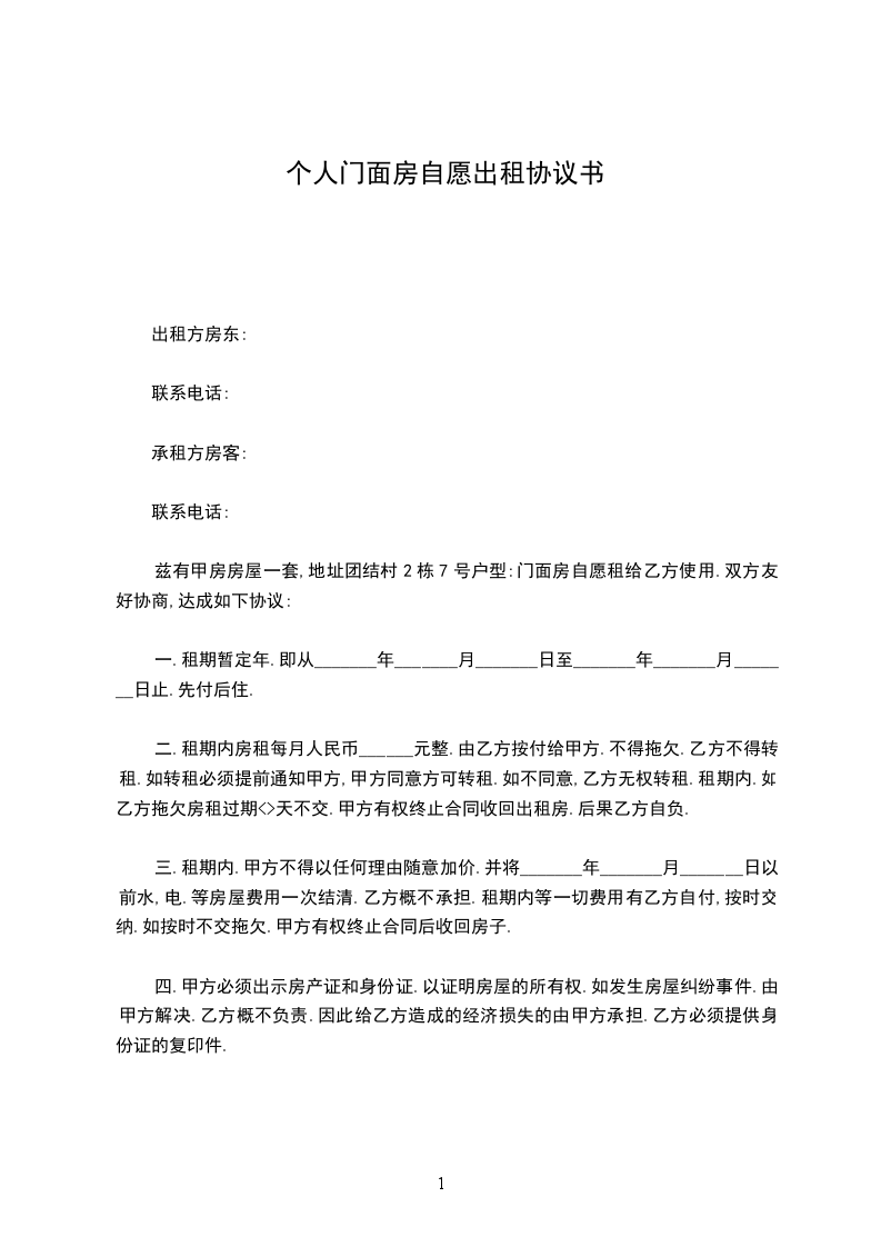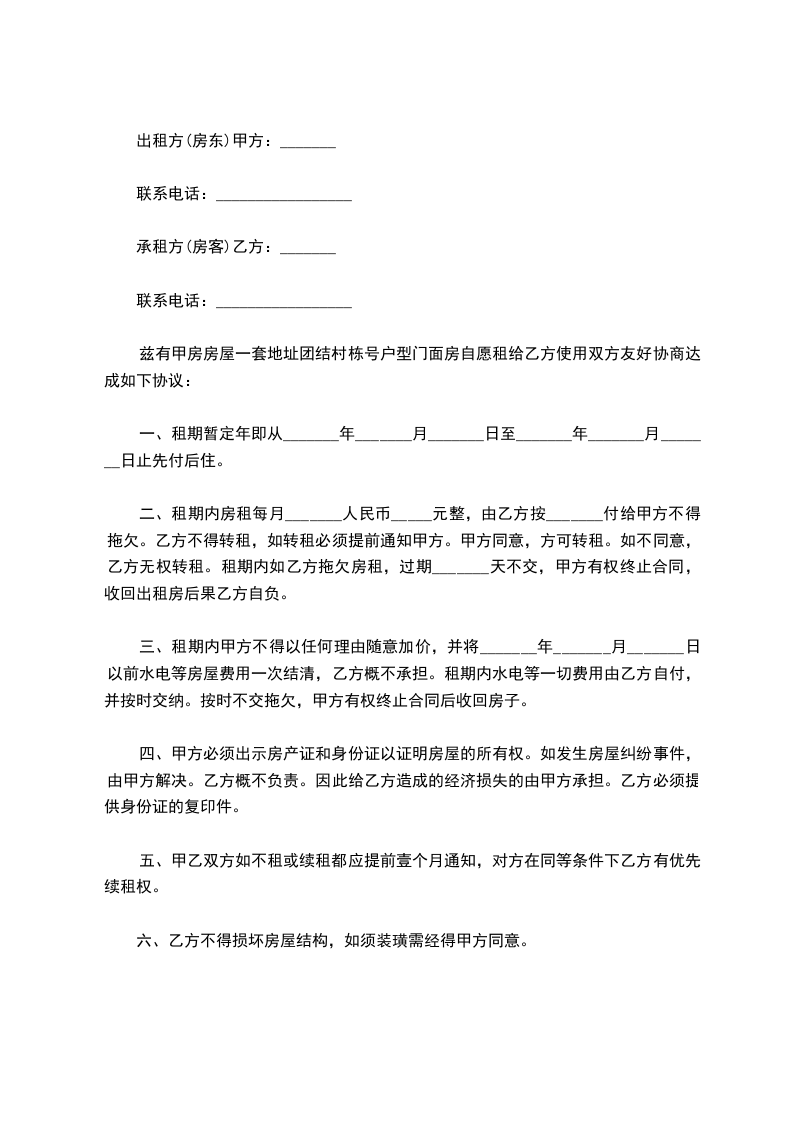 兹有甲房房屋一套地址团结村栋号户型门面房自愿租给乙方使用双方友好协商达成如下协议: