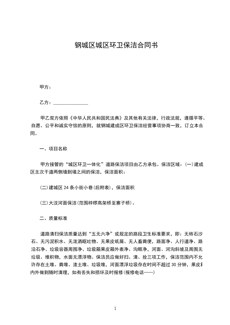 甲乙双方依照《中华人民共和国民法典》及其他有关法律,行政法规,遵循平等、自愿、公平和诚实守信的原则,就钢城建成区环卫保洁经营事项协商一致,订立本合同。