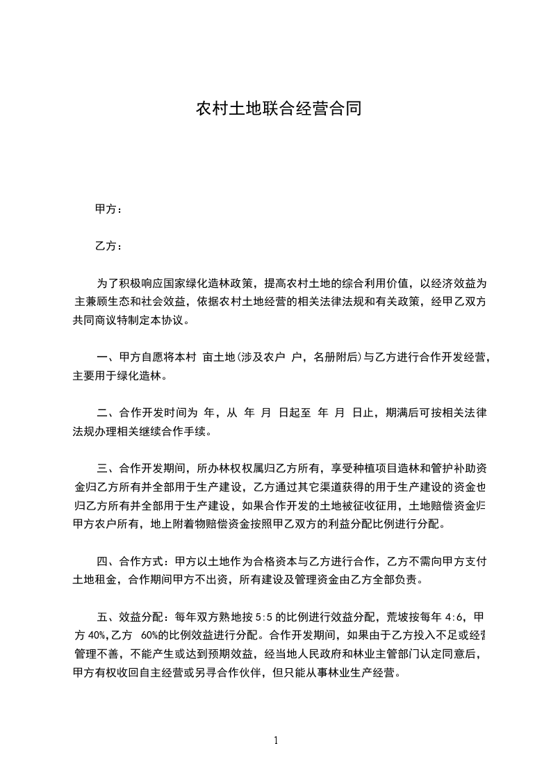 一、甲方自愿将本村 亩土地(涉及农户 户,名册附后)与乙方进行合作开发经营,主要用于绿化造林。