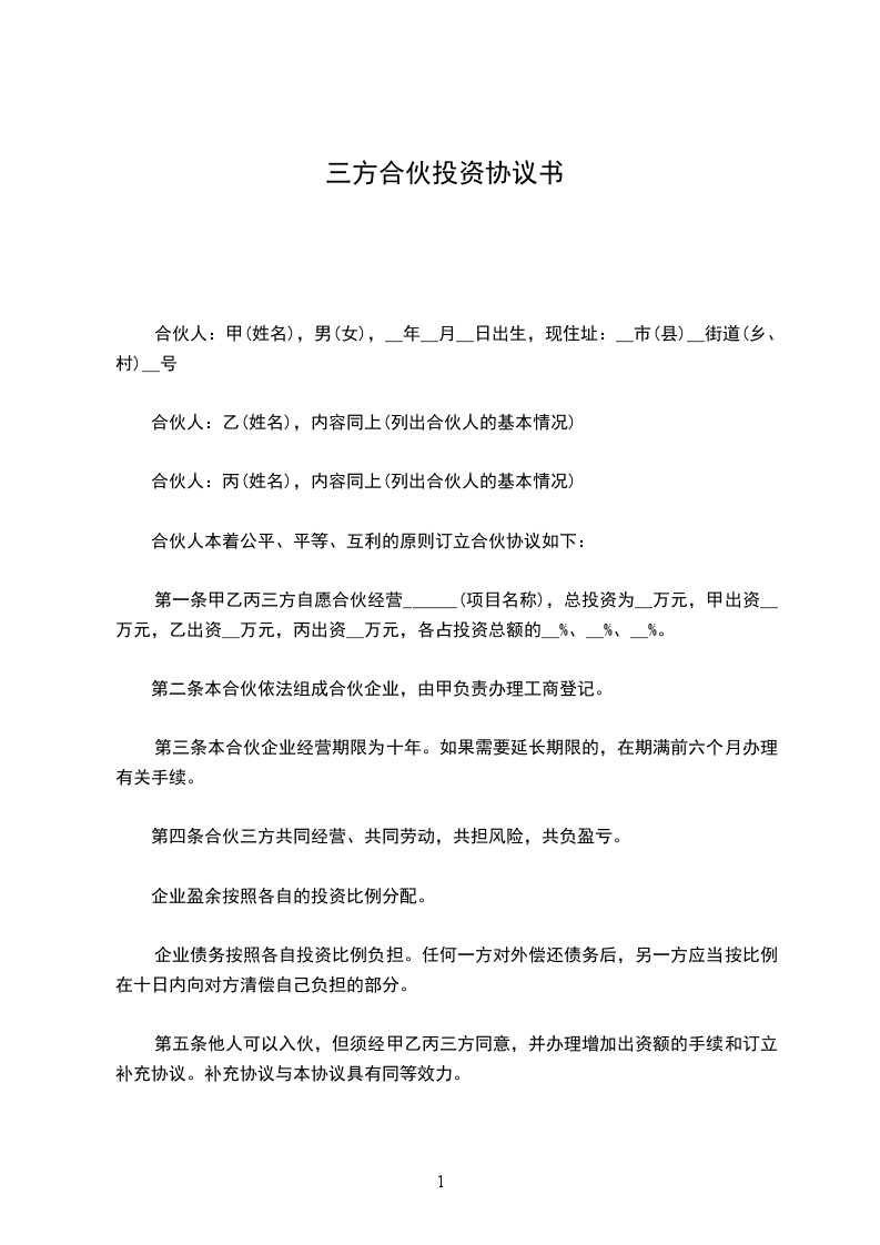 第一条甲乙丙三方自愿合伙经营______(项目名称),总投资为__万元,甲出资__万元,乙出资__万元,丙出资__万元,各占投资总额的__%、__%、__%。