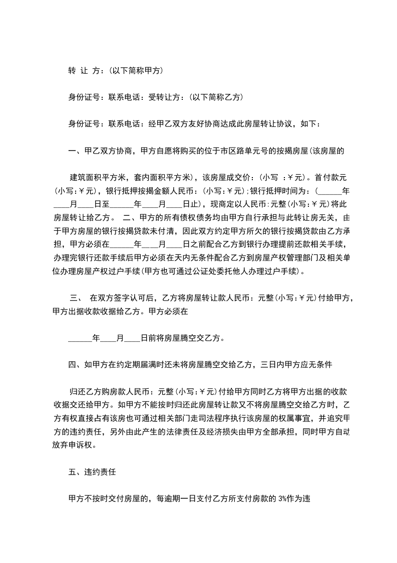 建筑面积平方米,套内面积平方米),该房屋成交价:(小写 :¥元)。首付款元(小写:¥元),银行抵押按揭金额人民币:(小写:¥元);银行抵押时间为:(______年____月____日至______年____月____日止),现商定以人民币:元整(小写:¥元)将此房屋转让给乙方。 二、甲方的所有债权债务均由甲方自行承担与此转让房无关,由于甲方房屋的银行按揭贷款未付清,因此双方约定甲方所欠的银行按揭贷款由乙方承担,甲方必须在______年____月____日之前配合乙方到银行办理提前还款相关手续,办理完银行还款手续后甲方必须在天内无条件配合乙方到房屋产权管理部门及相关单位办理房屋产权过户手续(甲方也可通过公证处委托他人办理过户手续)。