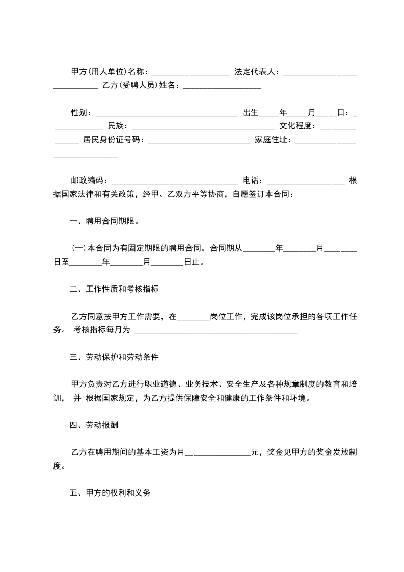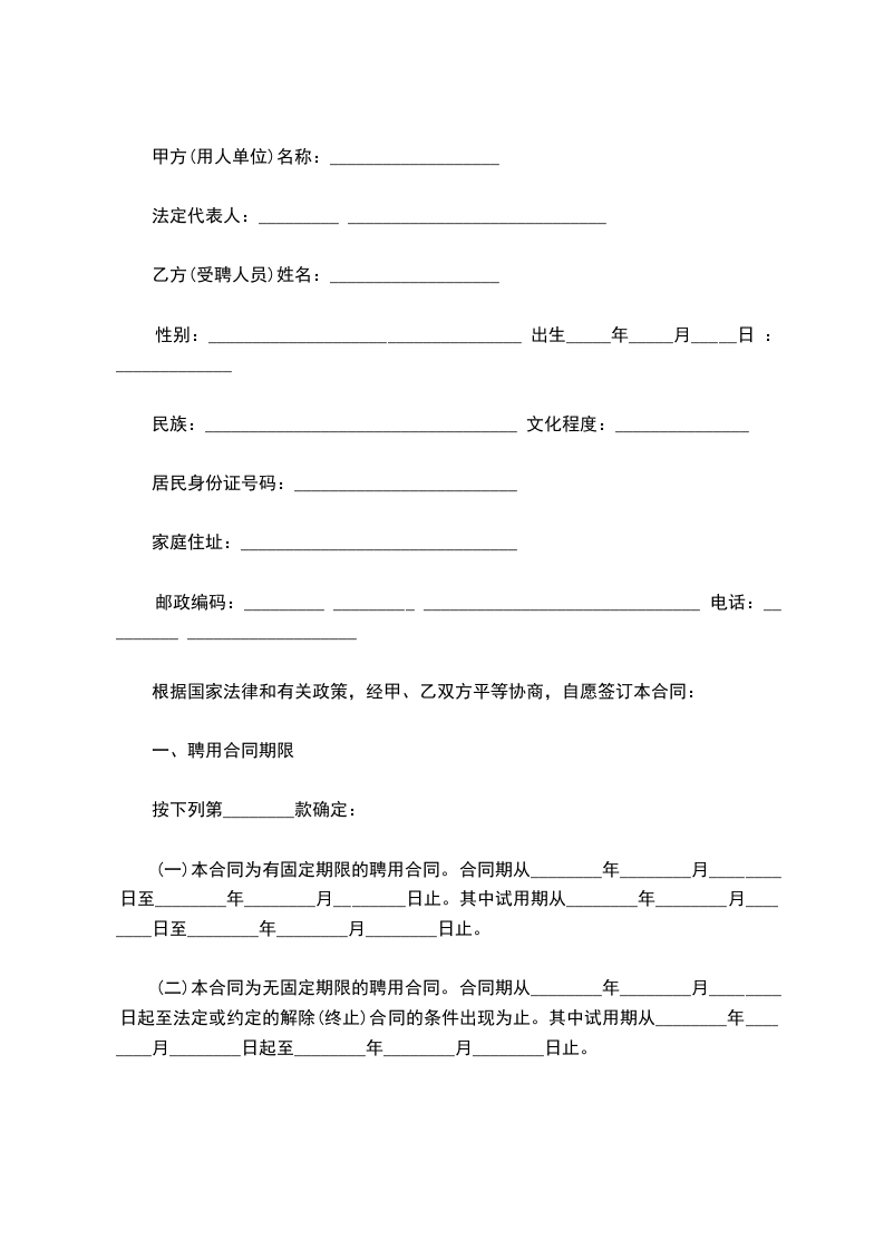 甲方(用人单位)名称:___________________ 法定代表人:_____________________________ 乙方(受聘人员)姓名:___________________