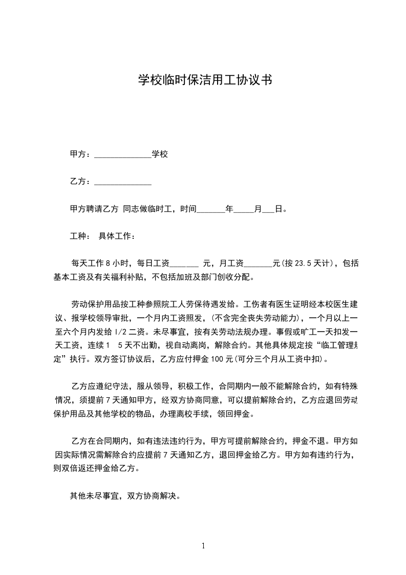 劳动保护用品按工种参照院工人劳保待遇发给。工伤者有医生证明经本校医生建议、报学校领导审批,一个月内工资照发,(不含完全丧失劳动能力),一个月以上一至六个月内发给l/2二资。未尽事宜,按有关劳动法规办理。事假或旷工一天扣发一天工资,连续1 5天不出勤,视自动离岗,解除合约。其他具体规定按“临工管理规定”执行。双方签订协议后,乙方应付押金100元(可分三个月从工资中扣)。