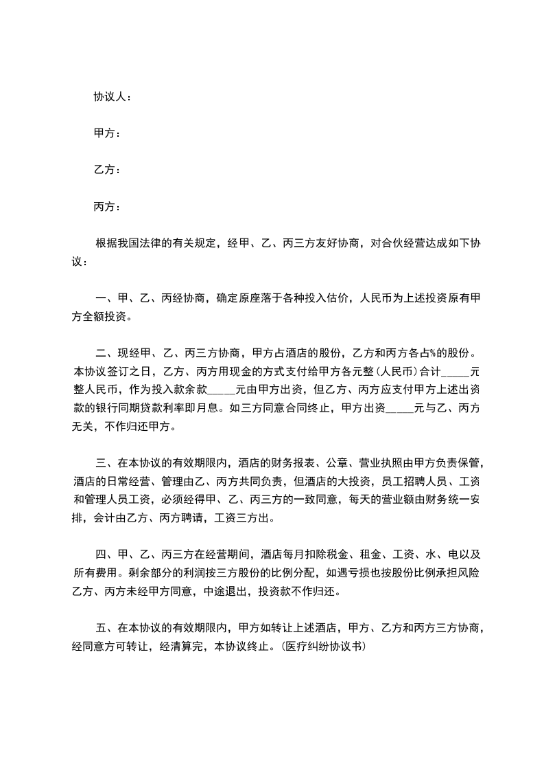 五、在本协议的有效期限内,甲方如转让上述酒店,甲方、乙方和丙方三方协商,经同意方可转让,经清算完,本协议终止。(医疗纠纷协议书)