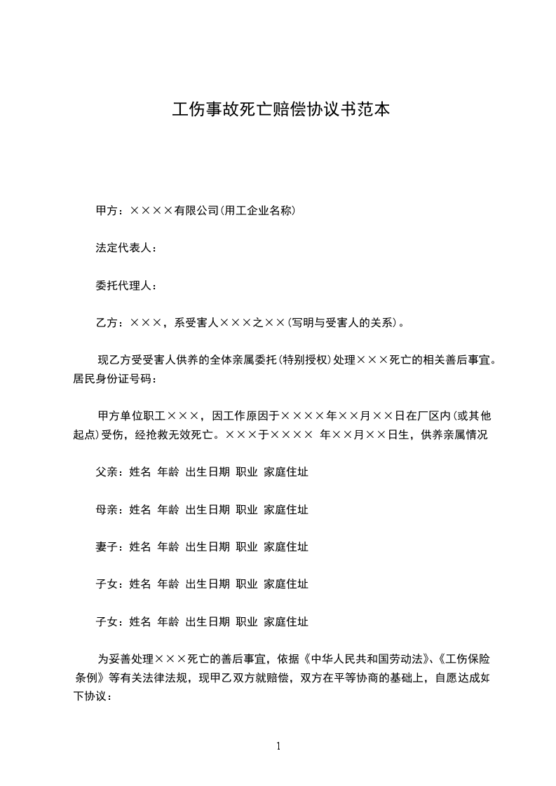 为妥善处理×××死亡的善后事宜,依据《中华人民共和国劳动法》、《工伤保险条例》等有关法律法规,现甲乙双方就赔偿,双方在平等协商的基础上,自愿达成如下协议: