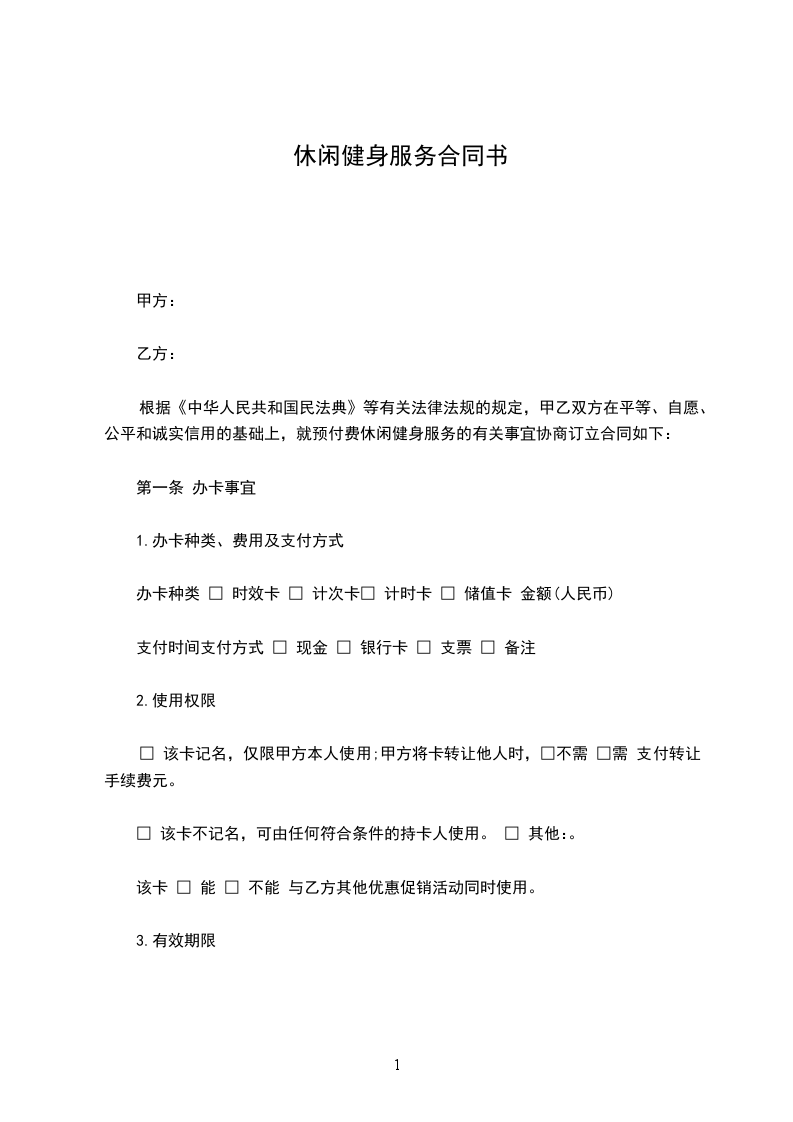 根据《中华人民共和国民法典》等有关法律法规的规定,甲乙双方在平等、自愿、公平和诚实信用的基础上,就预付费休闲健身服务的有关事宜协商订立合同如下: