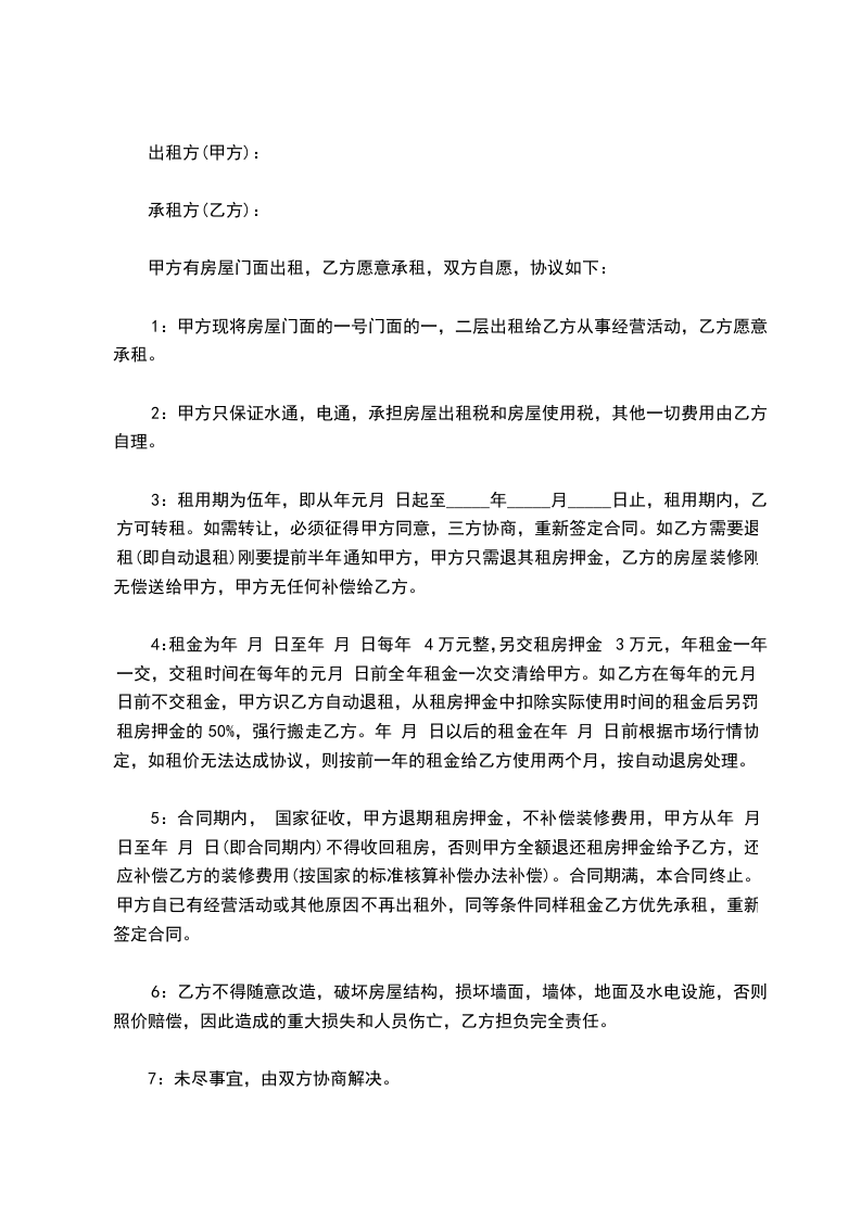1:甲方现将房屋门面的一号门面的一,二层出租给乙方从事经营活动,乙方愿意承租。