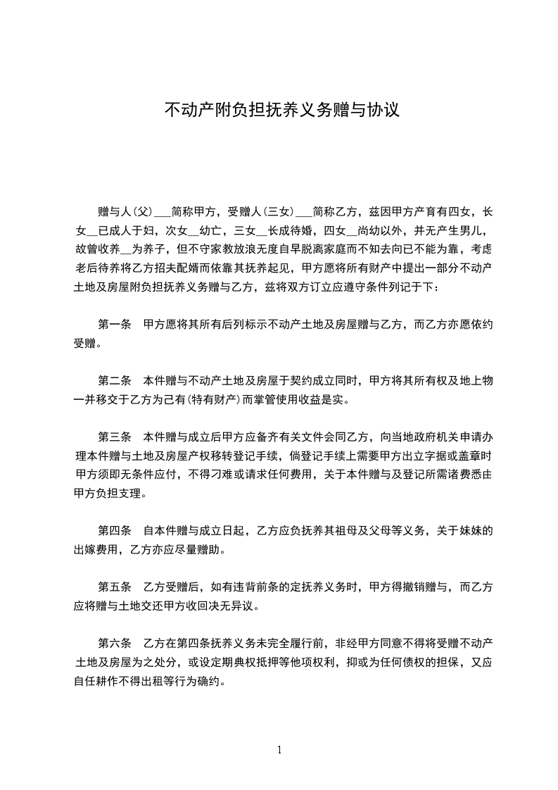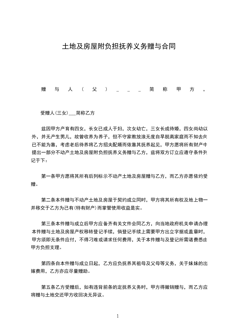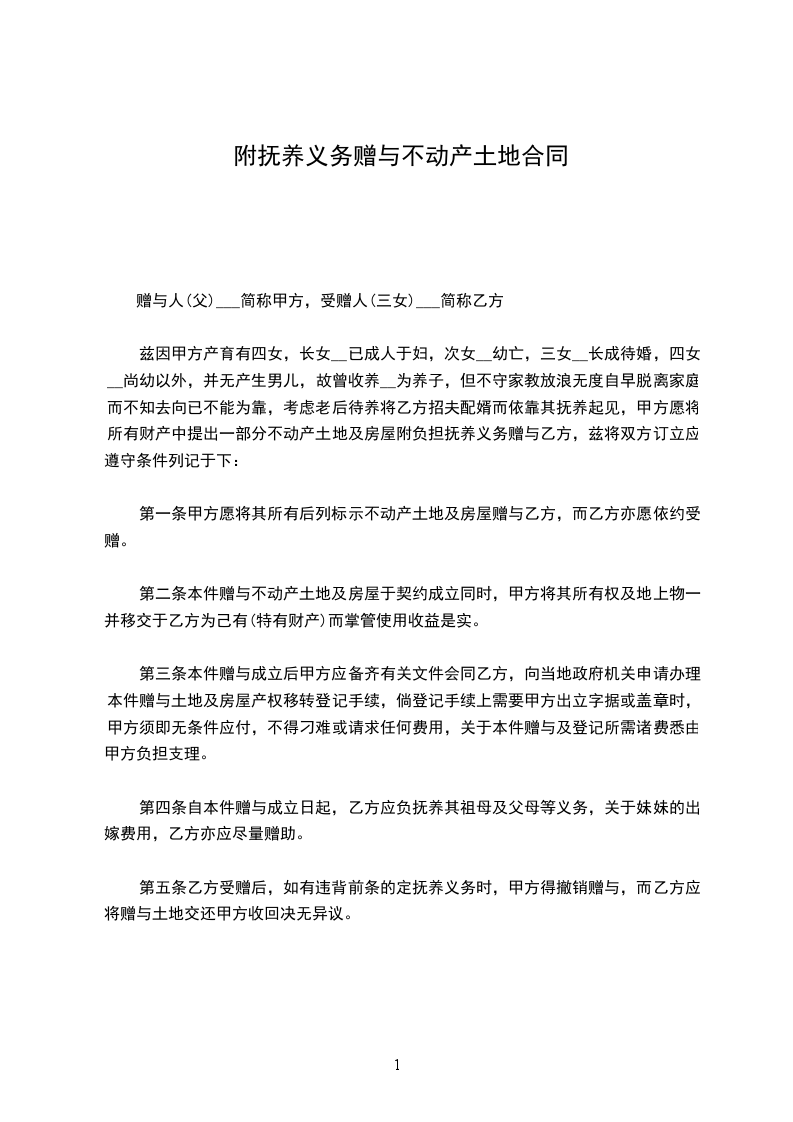 兹因甲方产育有四女,长女已成人于妇,次女幼亡,三女长成待婚,四女尚幼以外,并无产生男儿,故曾收养为养子,但不守家教放浪无度自早脱离家庭而不知去向已不能为靠,考虑老后待养将乙方招夫配婿而依靠其抚养起见,甲方愿将所有财产中提出一部分不动产土地及房屋附负担抚养义务赠与乙方,兹将双方订立应遵守条件列记于下: