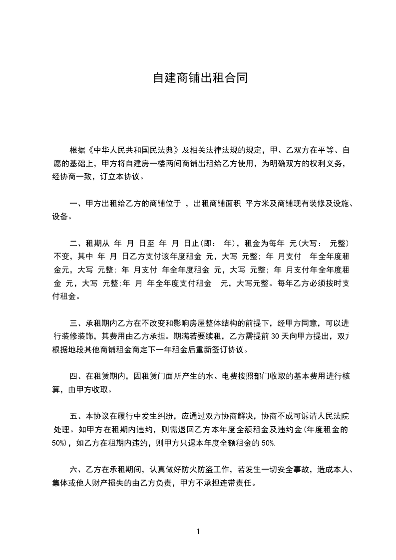 根据《中华人民共和国民法典》及相关法律法规的规定,甲、乙双方在平等、自愿的基础上,甲方将自建房一楼两间商铺出租给乙方使用,为明确双方的权利义务,经协商一致,订立本协议。
