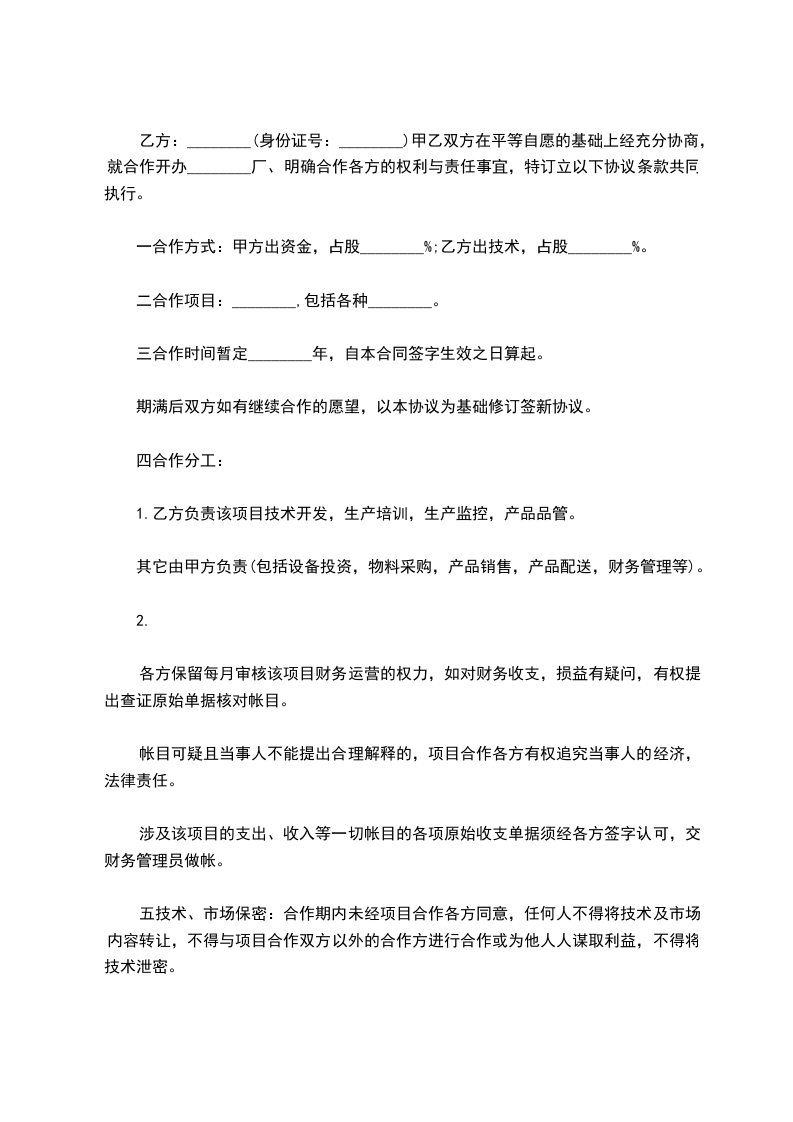 乙方:________(身份证号:________)甲乙双方在平等自愿的基础上经充分协商,就合作开办________厂、明确合作各方的权利与责任事宜,特订立以下协议条款共同执行。