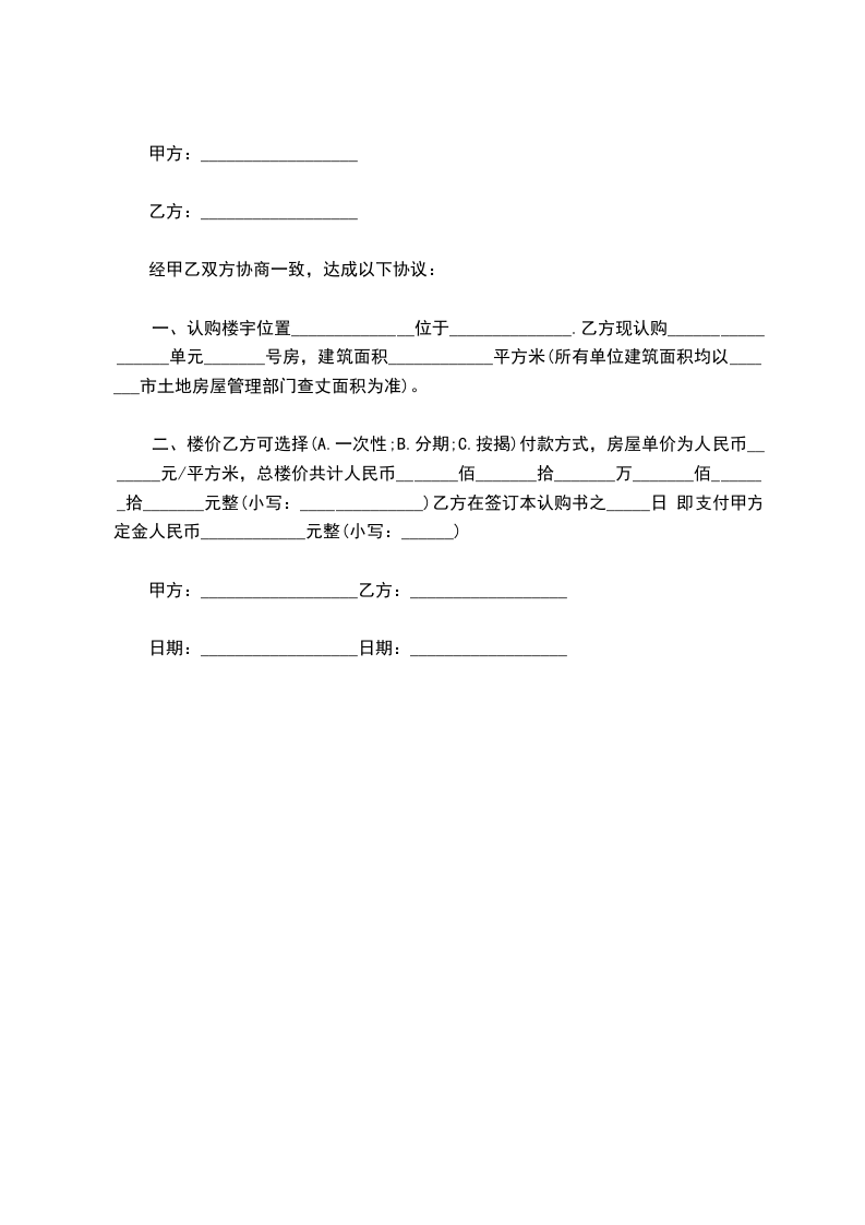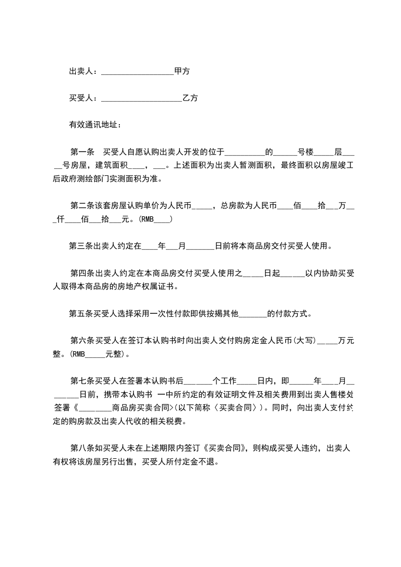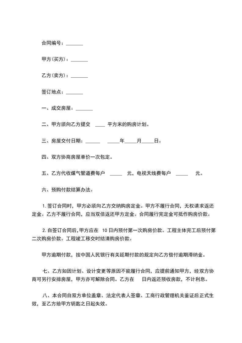 3.甲方逾期未交房的违约责任:甲方须协助乙方办理相关手续并在交期限内交房给乙方,逾期未交房或乙方发现建筑不合格,甲方须在____日内支付乙方所付定金的双倍作为赔偿,同时乙方有权选择继续购房或终止合同,其中如乙方选择终止合同,甲方须在____日内将乙方所付定金的双倍及已付款一次性退还给乙方。