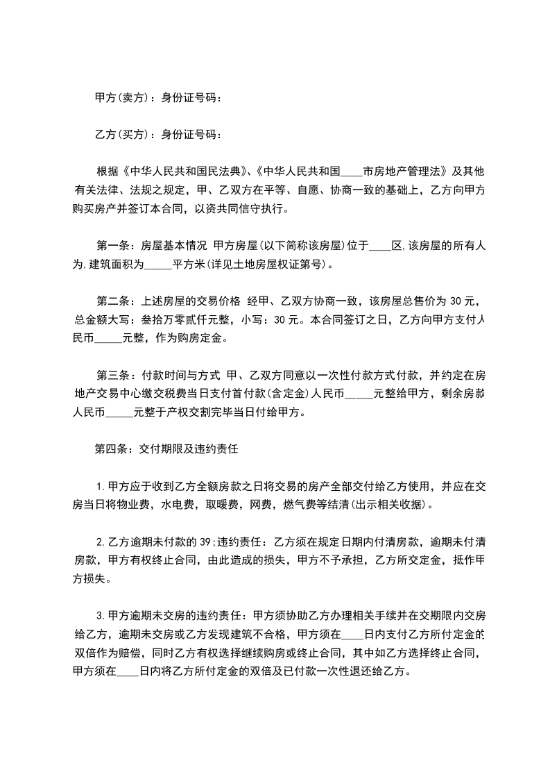 第二条:上述房屋的交易价格 经甲、乙双方协商一致,该房屋总售价为30元,总金额大写:叁拾万零贰仟元整,小写:30元。本合同签订之日,乙方向甲方支付人民币_____元整,作为购房定金。