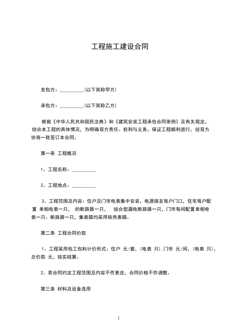 1、工程采用包工包料计价形式:住户 元/套,(电表 只),门市 元/间,(电表 只),总价款 元,按实结算。