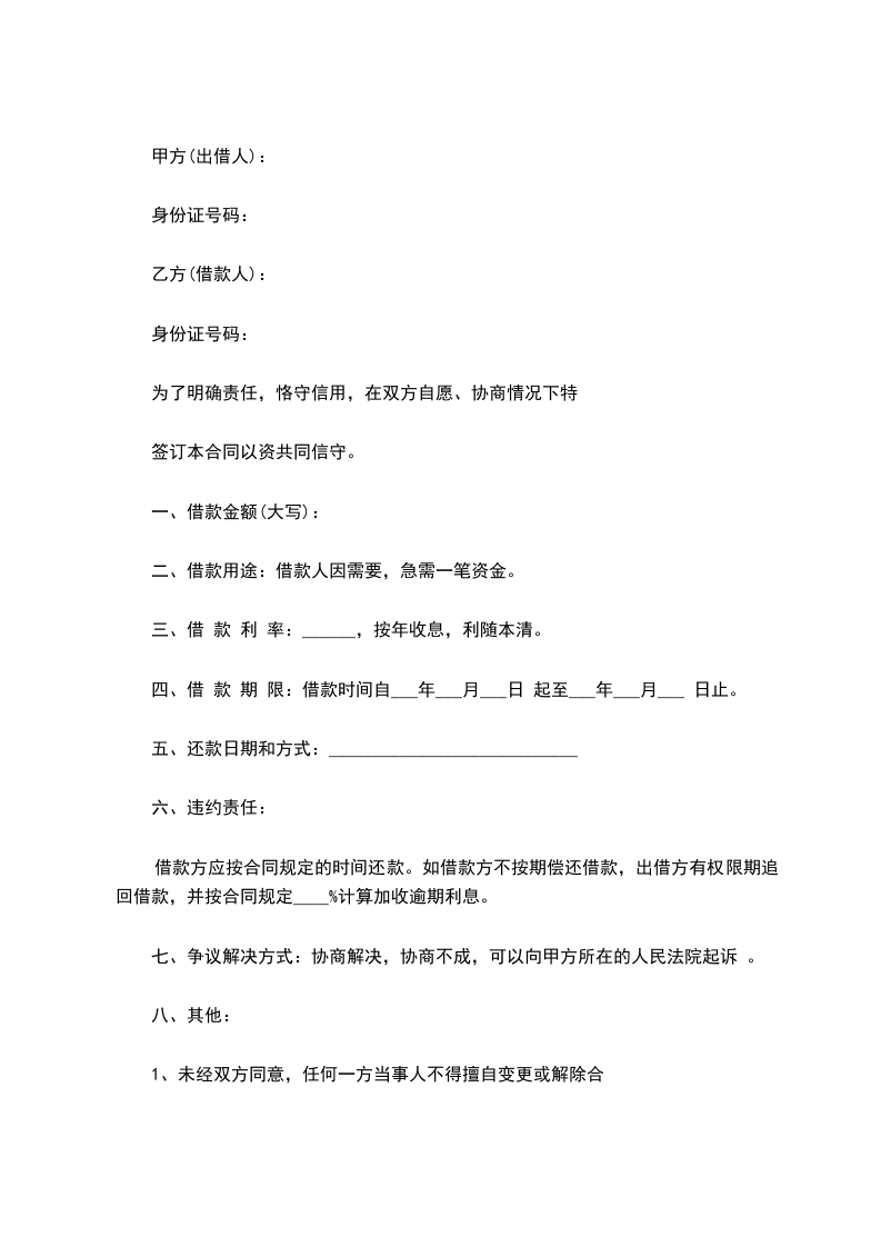 同。如一方当事人要求变更或解除合同,应在__日内通知另一方当事人,并达成书面协议。本合同变更或解除后,借款方占用的借款和应付的利息仍应按本合同的规定偿付。