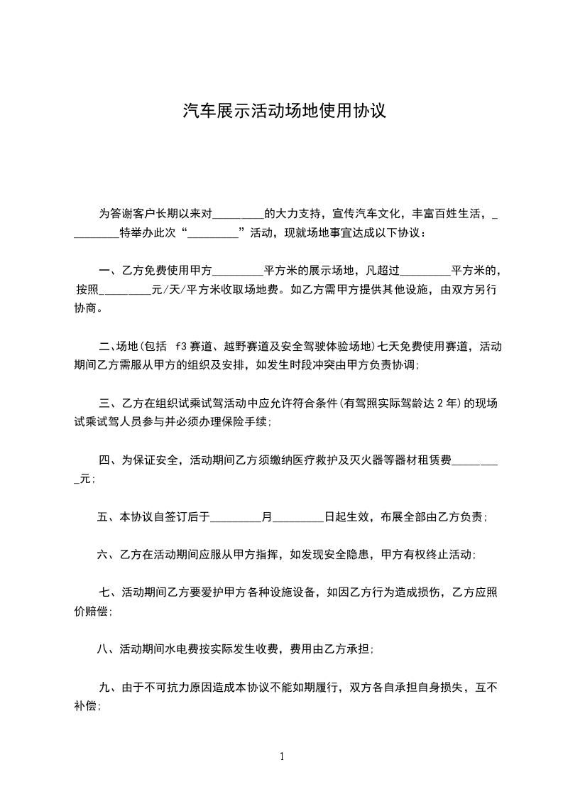 为答谢客户长期以来对_________的大力支持,宣传汽车文化,丰富百姓生活,_________特举办此次“_________”活动,现就场地事宜达成以下协议: