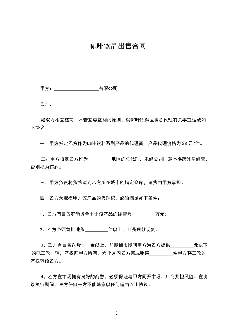 一、甲方指定乙方作为咖啡饮料系列产品的代理商。产品代理价格为28元/件。