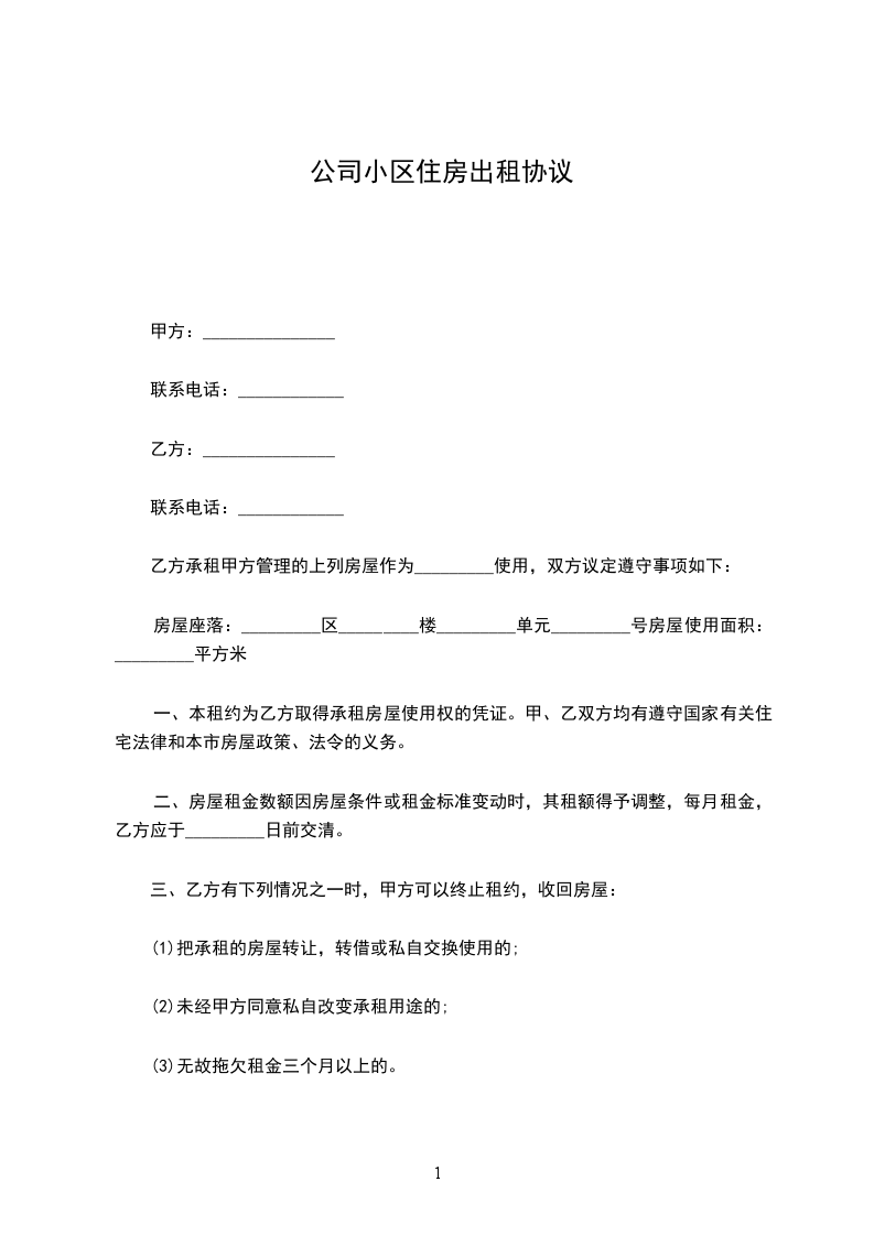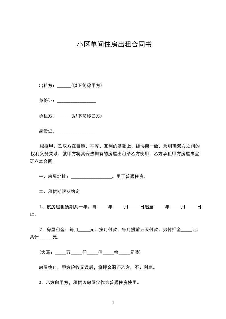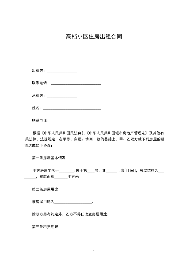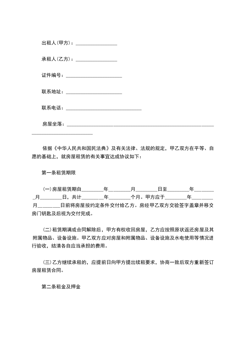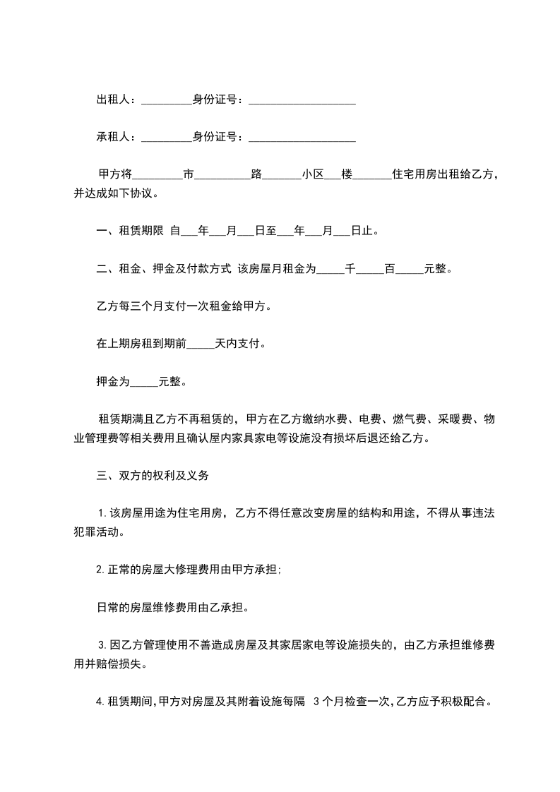 一、甲方将位于___________市________街道_______小区___号楼号的房屋出租给乙方居住使用,租赁期限自____________年______月___日至____________年______月___日,计___个月。