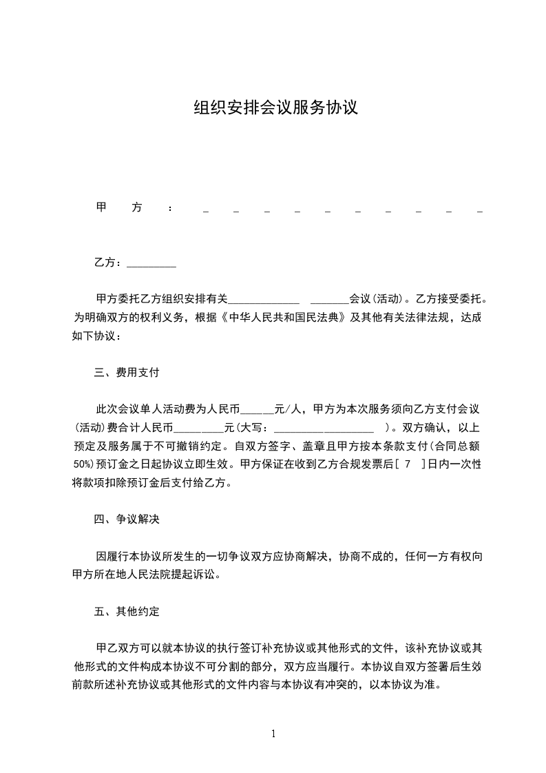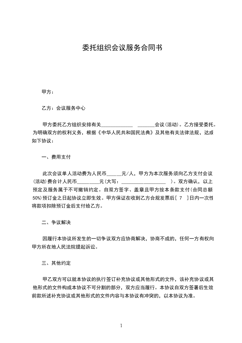 此次会议单人活动费为人民币______元/人,甲方为本次服务须向乙方支付会议(活动)费合计人民币_________元(大写:__________________ )。双方确认,以上预定及服务属于不可撤销约定。自双方签字、盖章且甲方按本条款支付(合同总额50%)预订金之日起协议立即生效。甲方保证在收到乙方合规发票后[ 7 ]日内一次性将款项扣除预订金后支付给乙方。