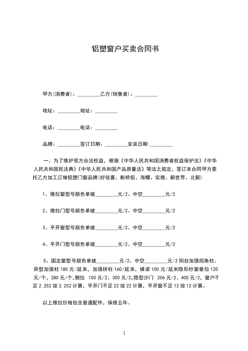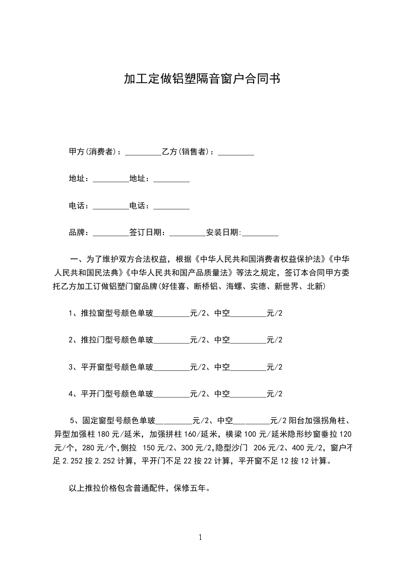 一、为了维护双方合法权益,根据《中华人民共和国消费者权益保护法》《中华人民共和国民法典》《中华人民共和国产品质量法》等法之规定,签订本合同甲方委托乙方加工订做铝塑门窗品牌(好佳喜、断桥铝、海螺、实德、新世界、北新)