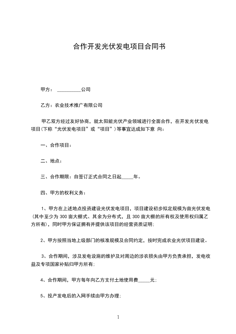 1、甲方在上述地点投资建设光伏发电项目,项目建设初步拟定规模为_____亩光伏发电(其中至少为300亩大棚式、其余为分布式,且300亩大棚的所有权及使用权归属乙方所有),同时甲方保证拥有并提供该项目的经营资质证明;