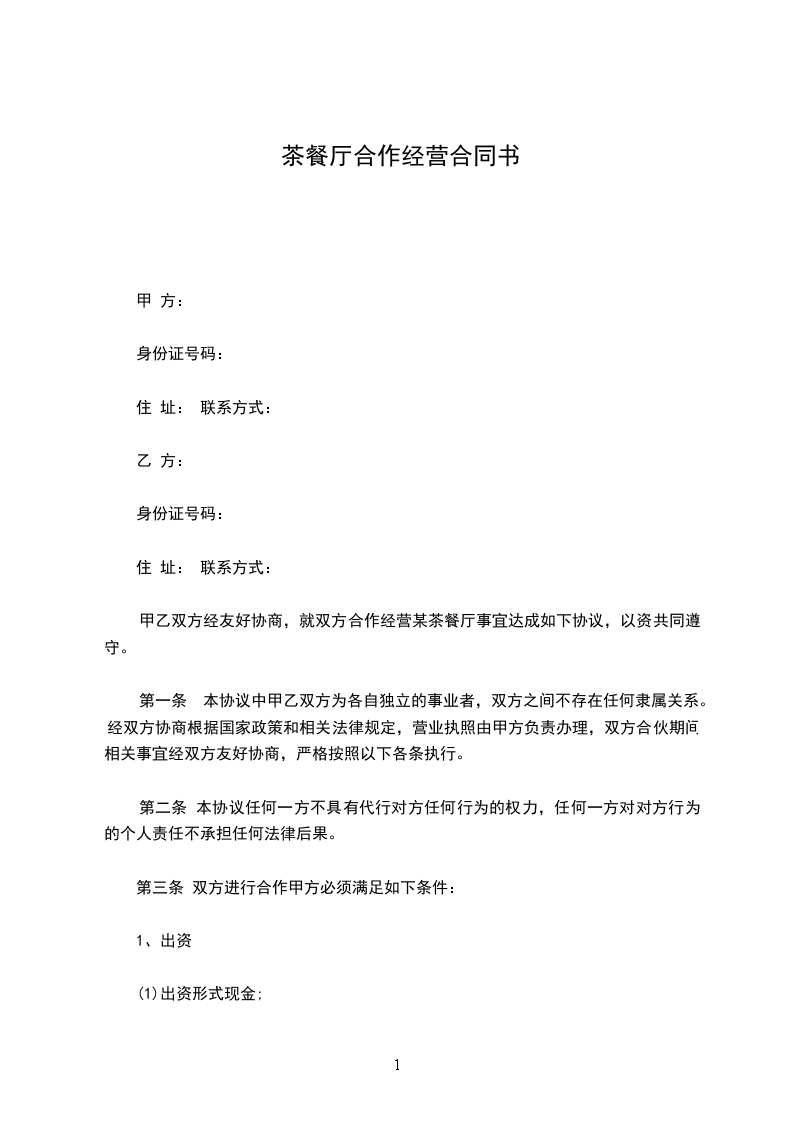 甲乙双方经友好协商,就双方合作经营某茶餐厅事宜达成如下协议,以资共同遵守。