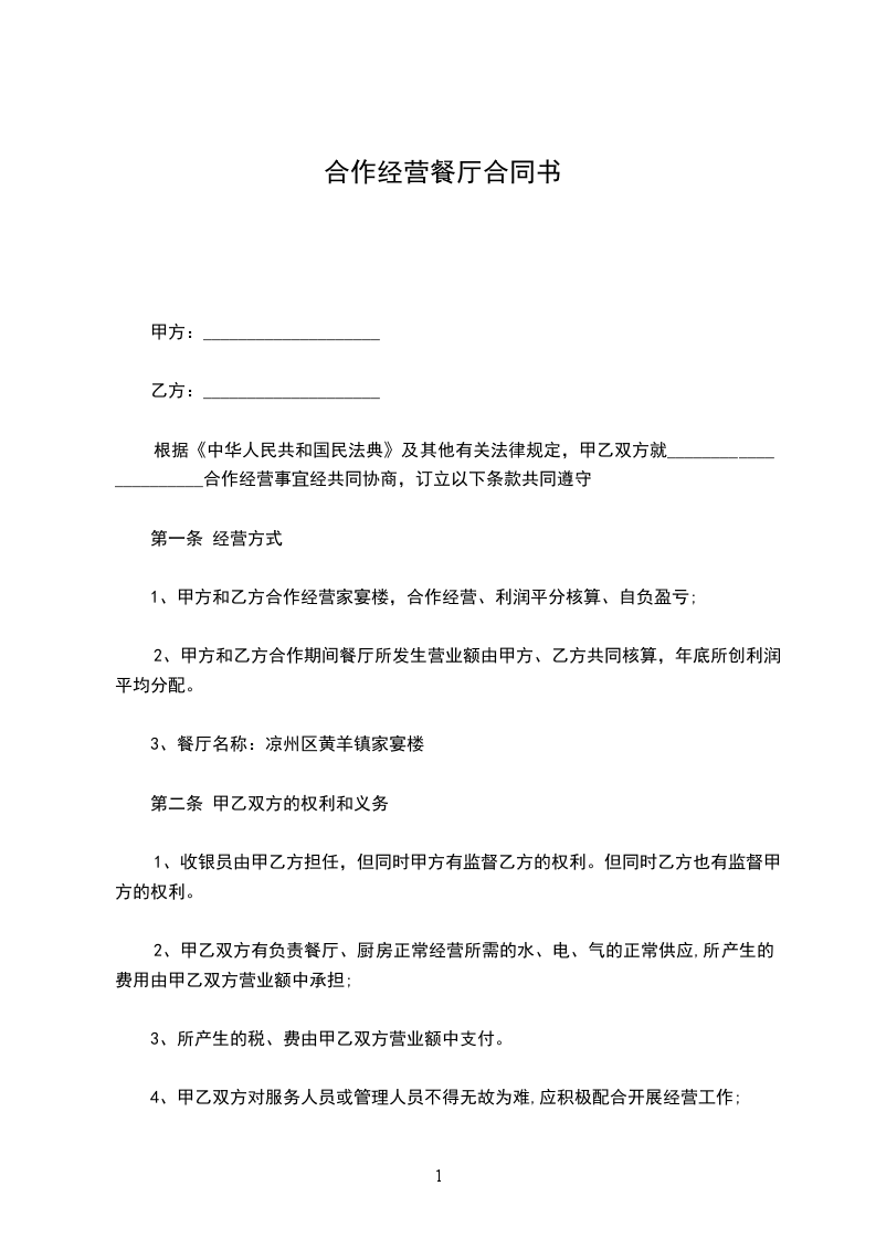 1、双方协商确定由于甲方负责店面日常经营活动,付予甲方工资 元。