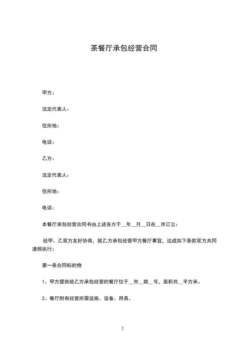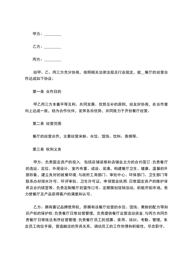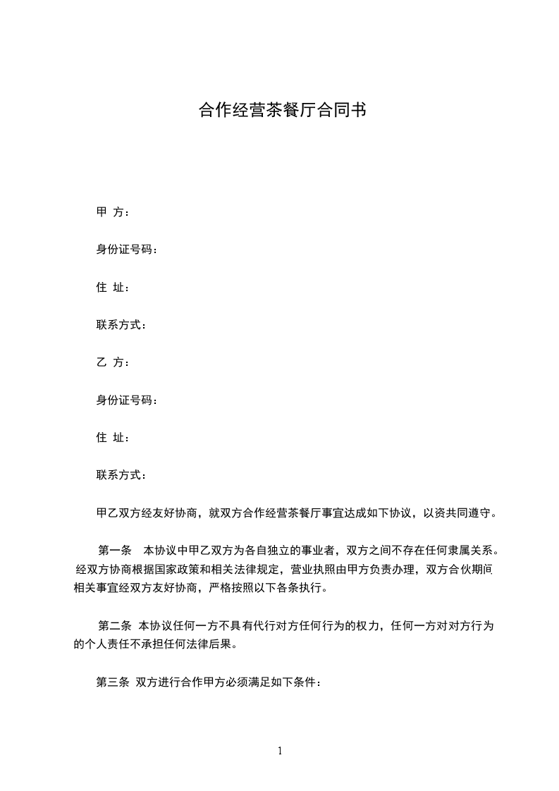 甲乙双方经友好协商,就双方合作经营茶餐厅事宜达成如下协议,以资共同遵守。