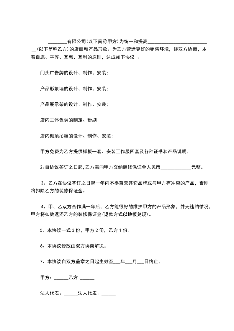 为统一和提高___________________________(以下简称乙方)的门面房和产品形象。为乙方营造更好的销售环境,经双方协商,本着自愿、平等、互惠、互利的原则,达成如下协议: