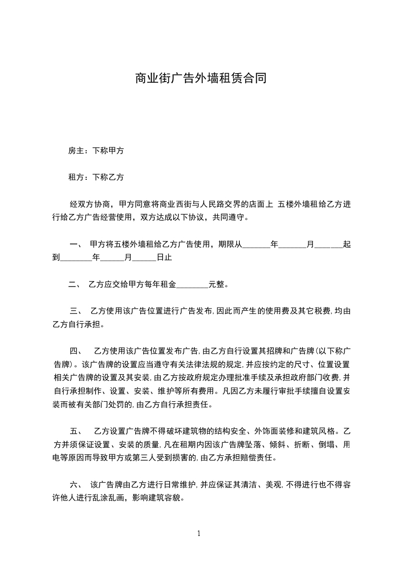 一、 甲方将五楼外墙租给乙方广告使用,期限从_______年_______月_______起到________年______月______日止