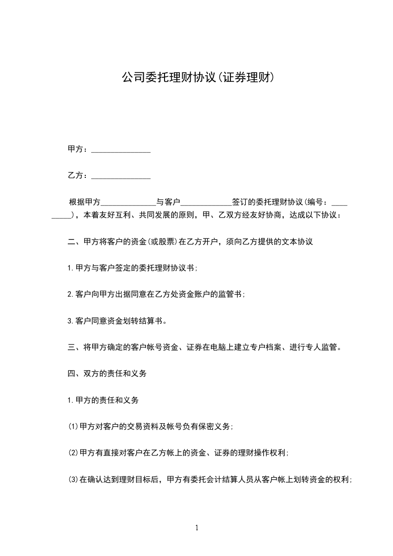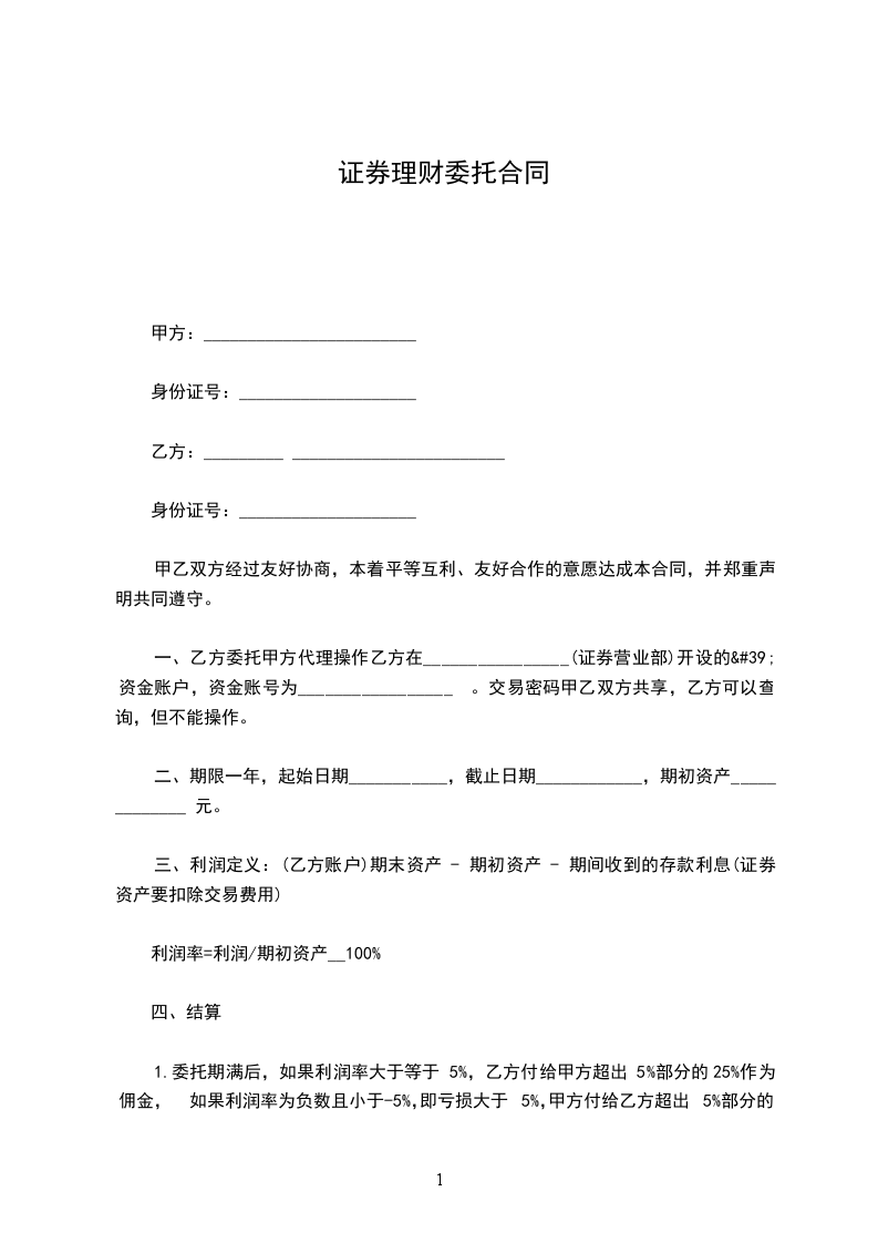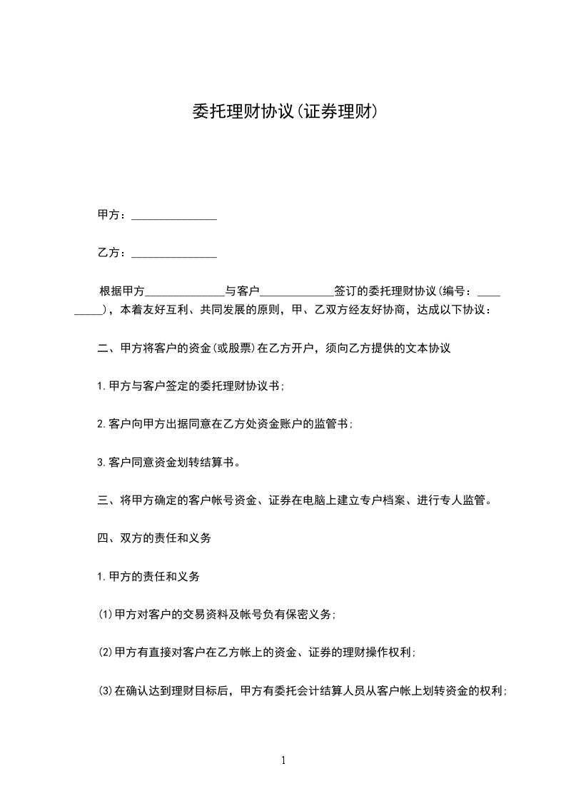 一、乙方委托甲方代理操作乙方在_________(证券营业部)开设的资金账户,资金账号为_________ 。交易密码甲乙双方共享,乙方可以查询,但不能操作。