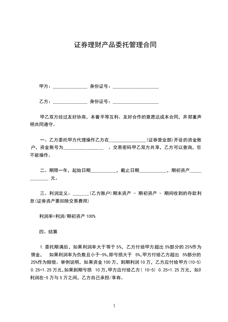 1.委托期满后,如果利润率大于等于5%,乙方付给甲方超出5%部分的25%作为佣金,如果利润率为负数且小于-5%,即亏损大于5%,甲方付给乙方超出5%部分的25%作为赔偿。举例说明,如果资金100万,到期利润10万,乙方应付给甲方(10-5)×0.25=1.25万元,如果到期亏损10万,甲方应付给乙方(10-5)× 0.25=1.25万元,如果利润在-5万与5万之间,乙方自己承担/享有。