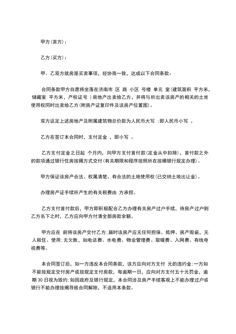 合同条款甲方自愿将坐落在济南市 区 路 小区 号楼 单元 室(建筑面积 平方米,储藏室 平方米,产权证号 )房地产出卖给乙方,并将与所出卖该房产的相关的土地使用权同时出卖给乙方(附房产证复印件及该房产位置图)。