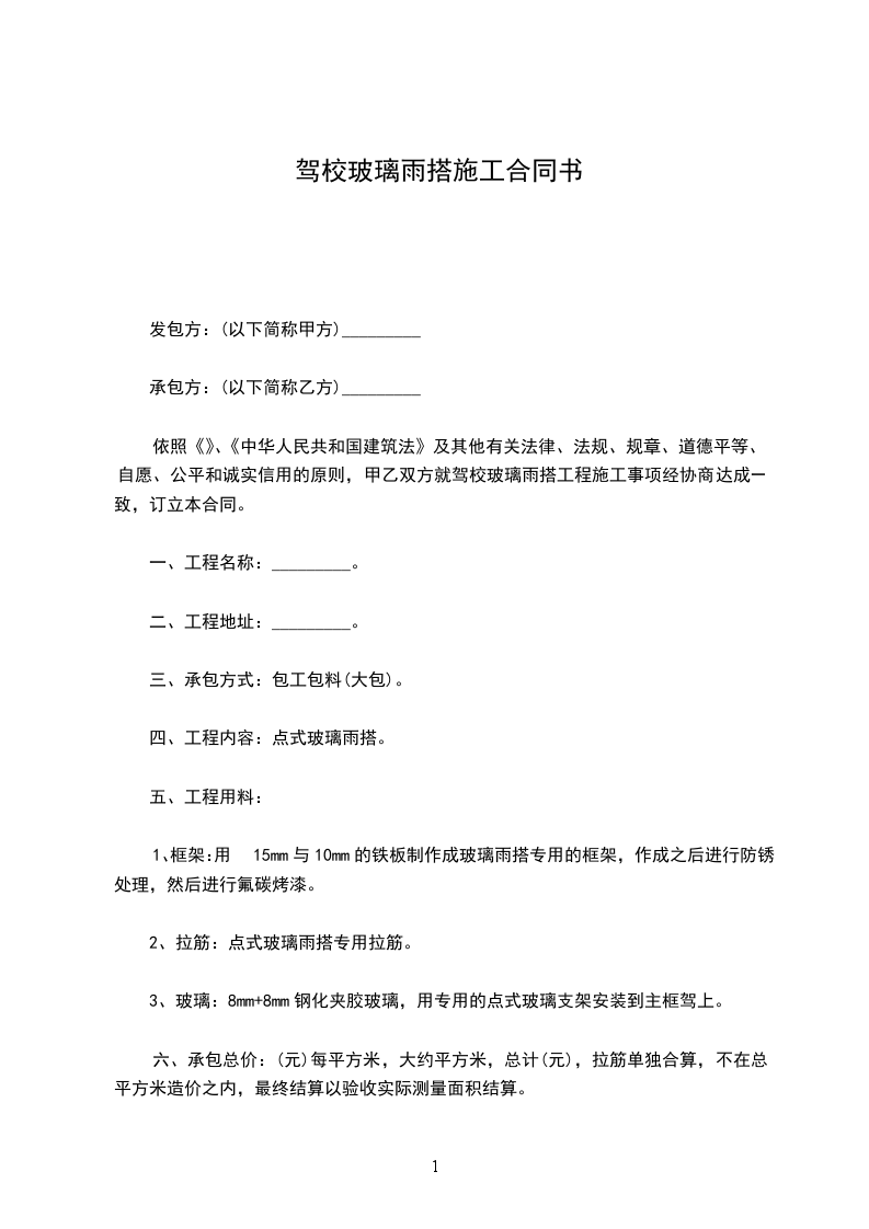 依照《》、《中华人民共和国建筑法》及其他有关法律、法规、规章、道德平等、自愿、公平和诚实信用的原则,甲乙双方就驾校玻璃雨搭工程施工事项经协商达成一致,订立本合同。