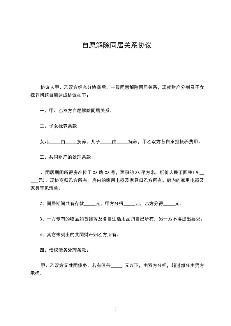 协议人甲、乙双方经充分协商后,一致同意解除同居关系,现就财产分割及子女抚养问题自愿达成协议如下: