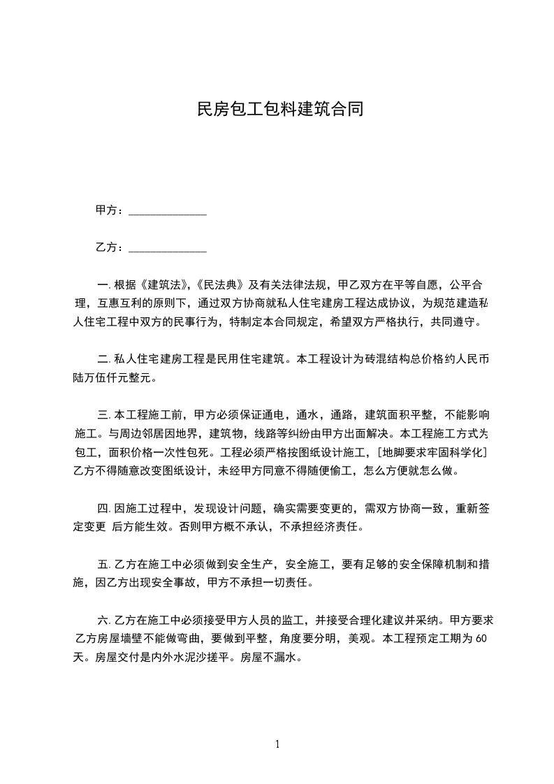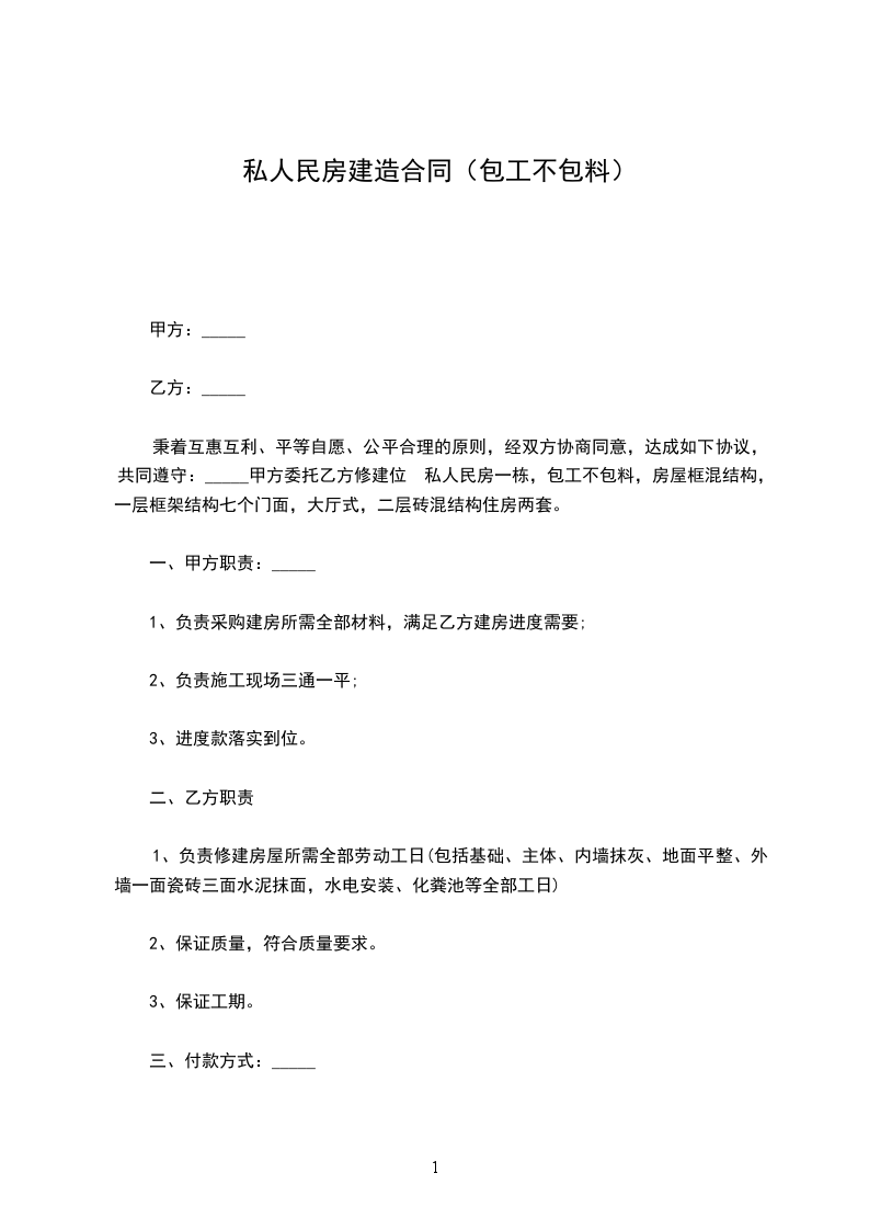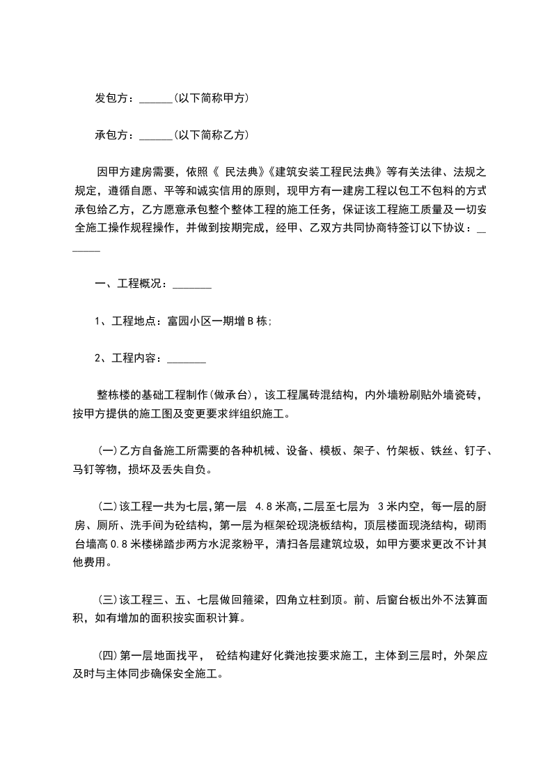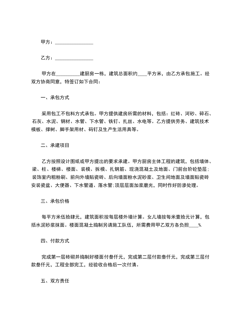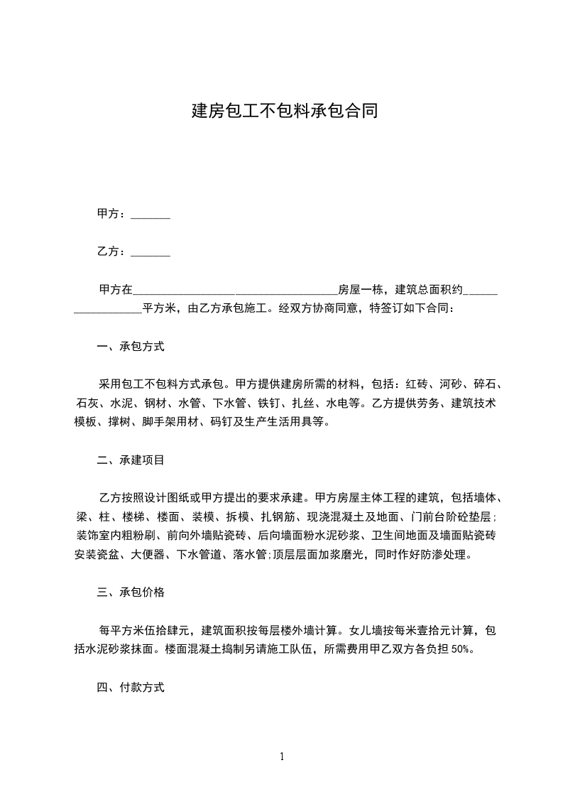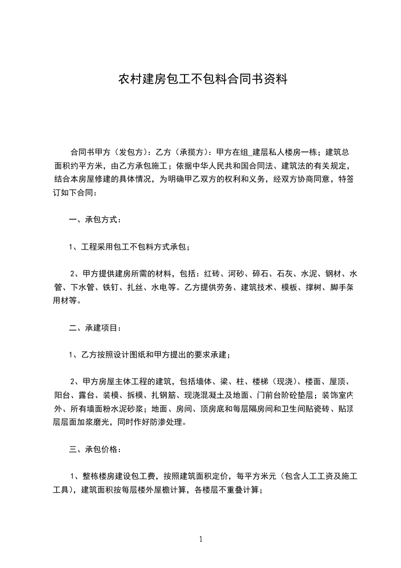 采用包工不包料方式承包。甲方提供建房所需的材料,包括:红砖、河砂、碎石、石灰、水泥、钢材、水管、下水管、铁钉、扎丝、水电等。乙方提供劳务、建筑技术、模板、撑树、脚手架用材、码钉及生产生活用具等。