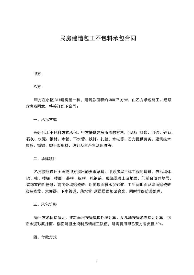 甲方在小区31#建房屋一栋,建筑总面积约300平方米,由乙方承包施工。经双方协商同意,特签订如下合同: