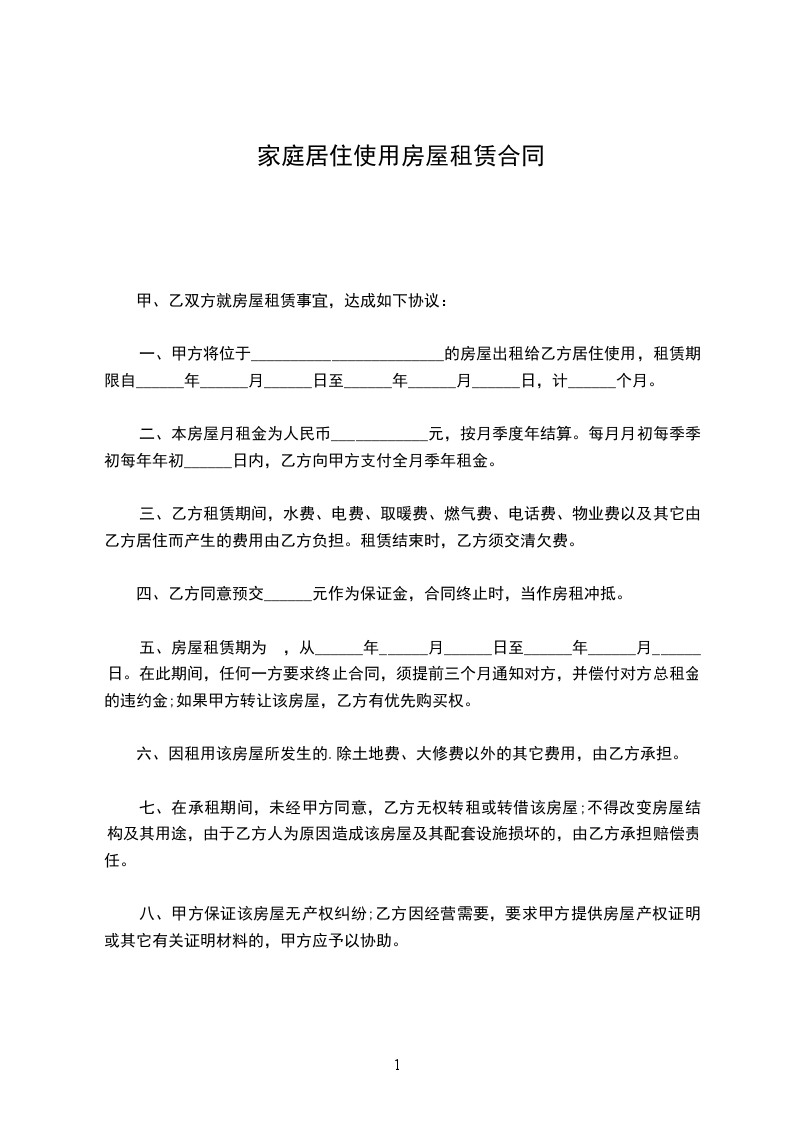 一、甲方将位于________________________的房屋出租给乙方居住使用,租赁期限自______年______月______日至______年______月______日,计______个月。