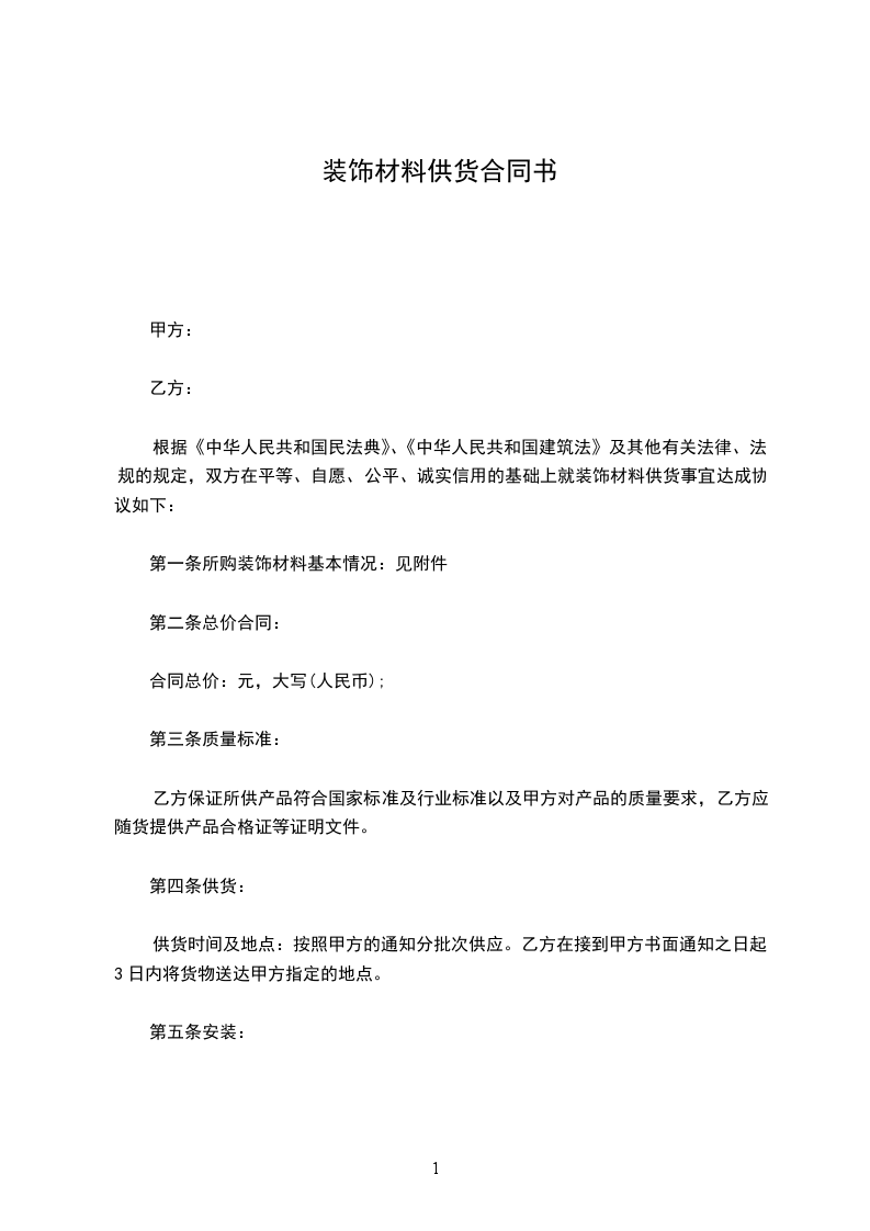 根据《中华人民共和国民法典》、《中华人民共和国建筑法》及其他有关法律、法规的规定,双方在平等、自愿、公平、诚实信用的基础上就装饰材料供货事宜达成协议如下: