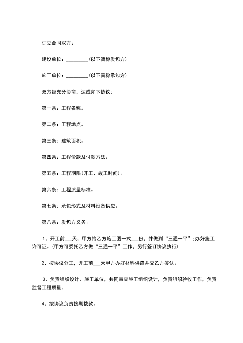 1、开工前___天,甲方给乙方施工图一式___份,并做到“三通一平”;办好施工许可证。(甲方可委托乙方做“三通一平”工作,另行签订协议执行)