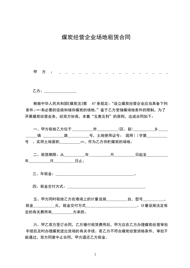 一、甲方租给乙方位于___________市___________(区、县)___________乡___________镇 ___________路___________号,土地使用证号: 国用( )字第___________号 、实用土地面积___________㎡,作为乙方存贮煤炭的场地。