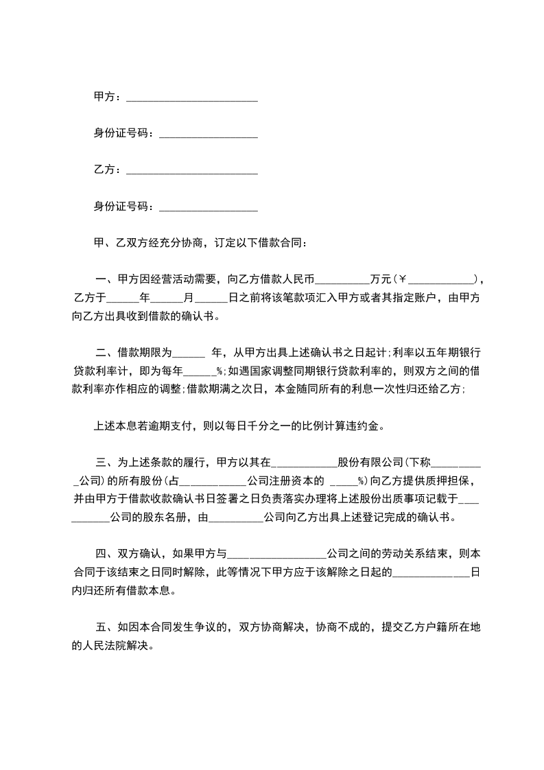 二、借款期限为______ 年,从甲方出具上述确认书之日起计;利率以五年期银行贷款利率计,即为每年______%;如遇国家调整同期银行贷款利率的,则双方之间的借款利率亦作相应的调整;借款期满之次日,本金随同所有的利息一次性归还给乙方;