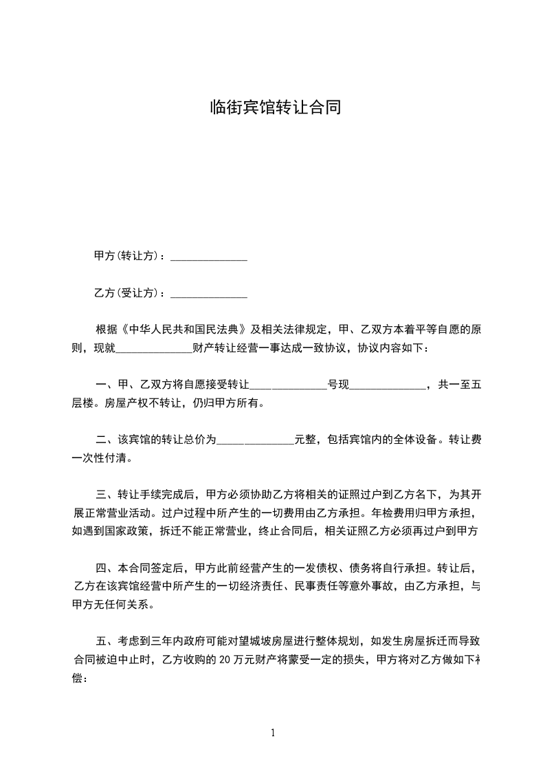 二、该宾馆的转让总价为______________元整,包括宾馆内的全体设备。转让费一次性付清。